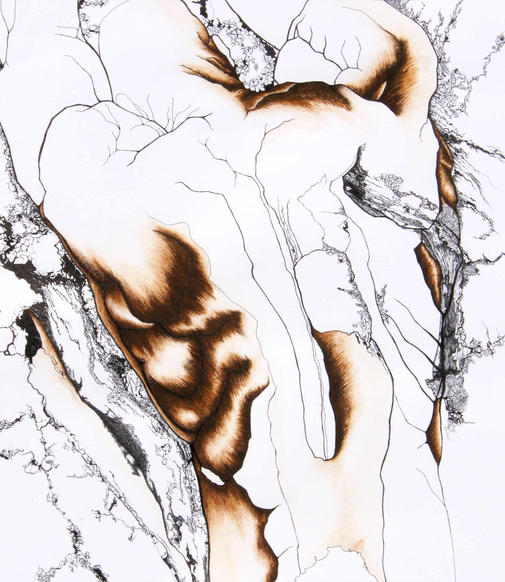 Spreekwoord 'Door de ziel gaan'. Oefening in versmelting figuur - structuur met de focus op de omgeving. Materiaal inkt & gouache