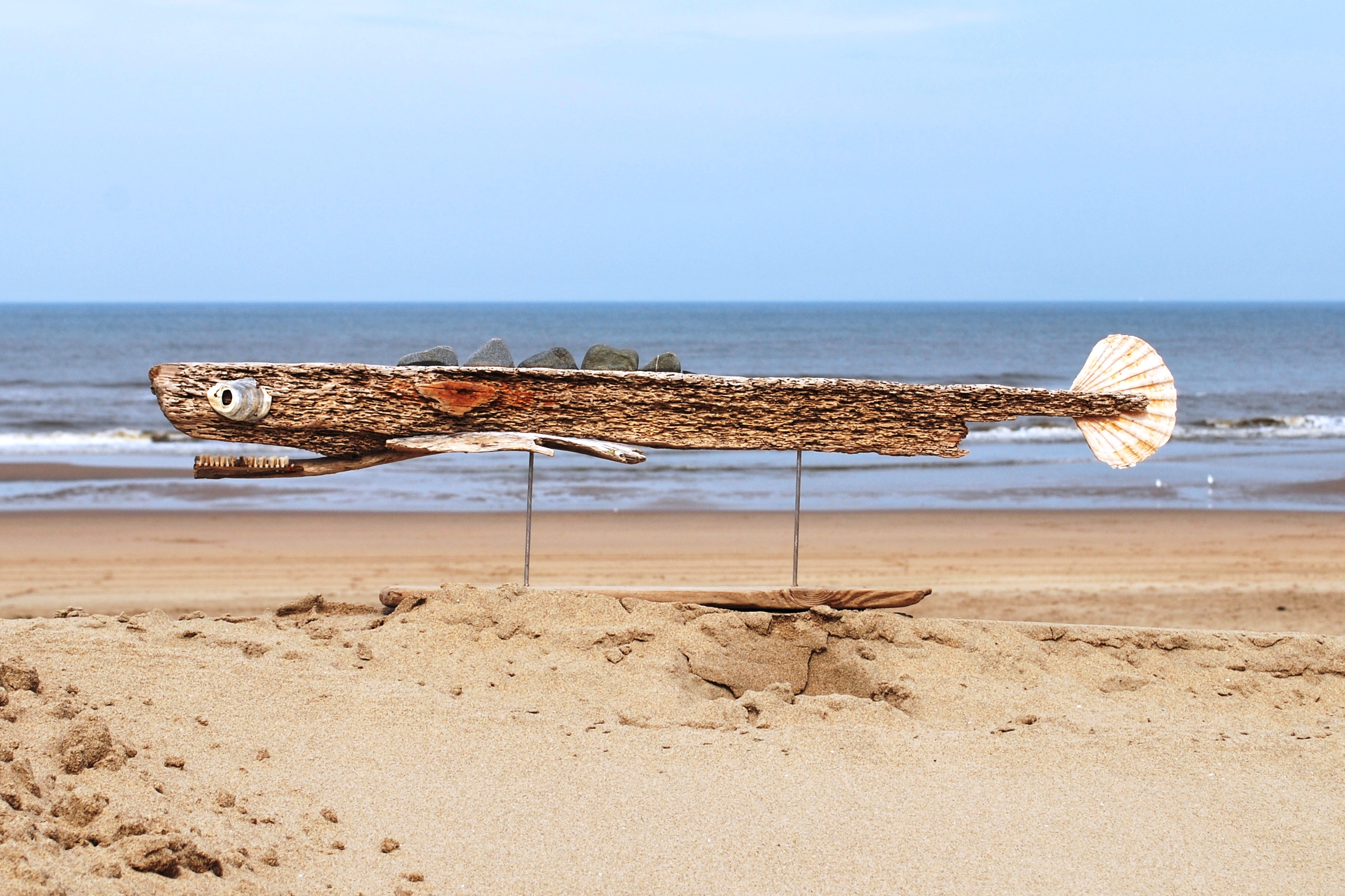 maakt al jaren houten beelden door natuurlijke objecten uit zee te koppelen. De beelden zijn ruw en puur.