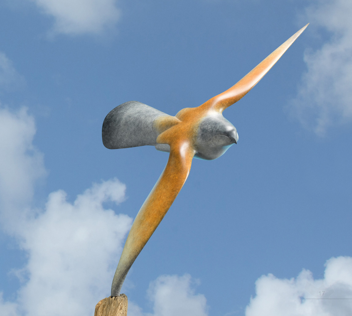Torenvalk in brons gepatineerd op eiken sokkel