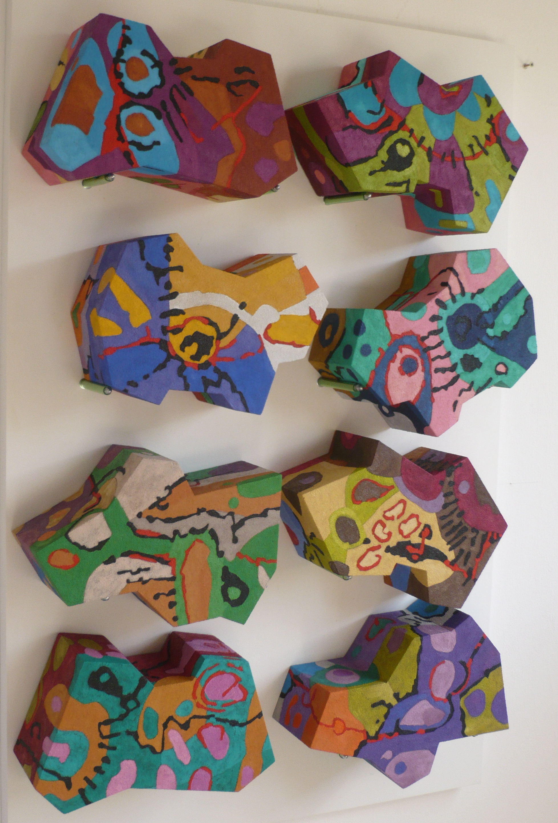 Abstracte schilderijen en dito beschilderde objecten in een stijl die ligt tussen geraffineerde eenvoud en georganiseerde chaos