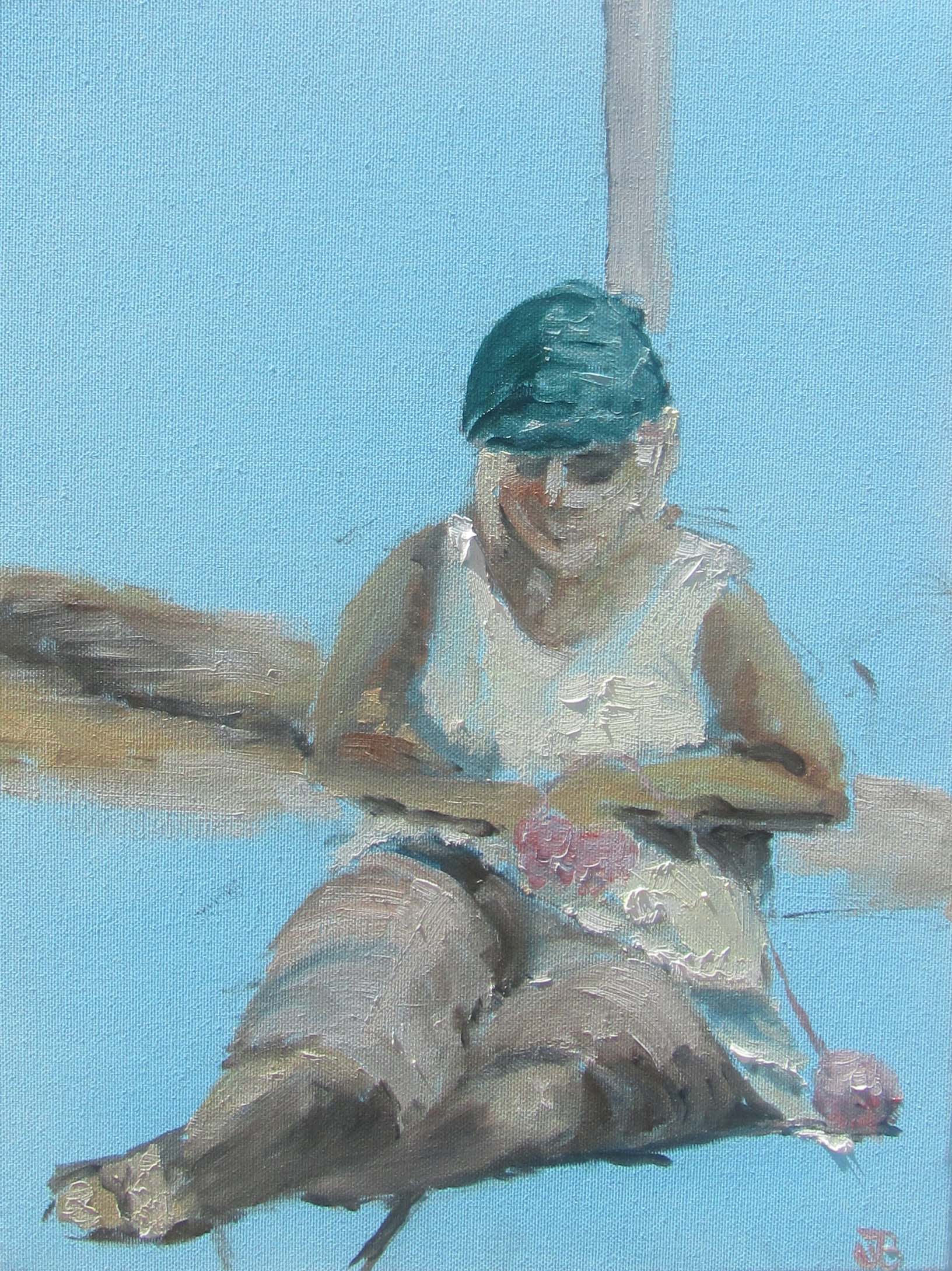 Jeanette tijdens een workshop haken op het strand van Katwijk