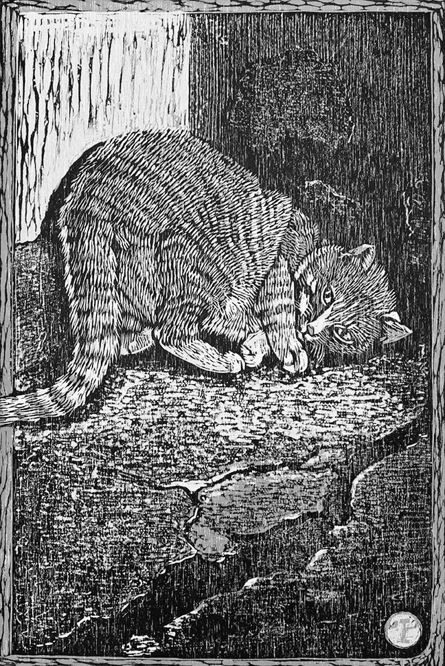 Kat in Parijs (Montmartre) in grijstinten. Houtsnede, reductietechniek.