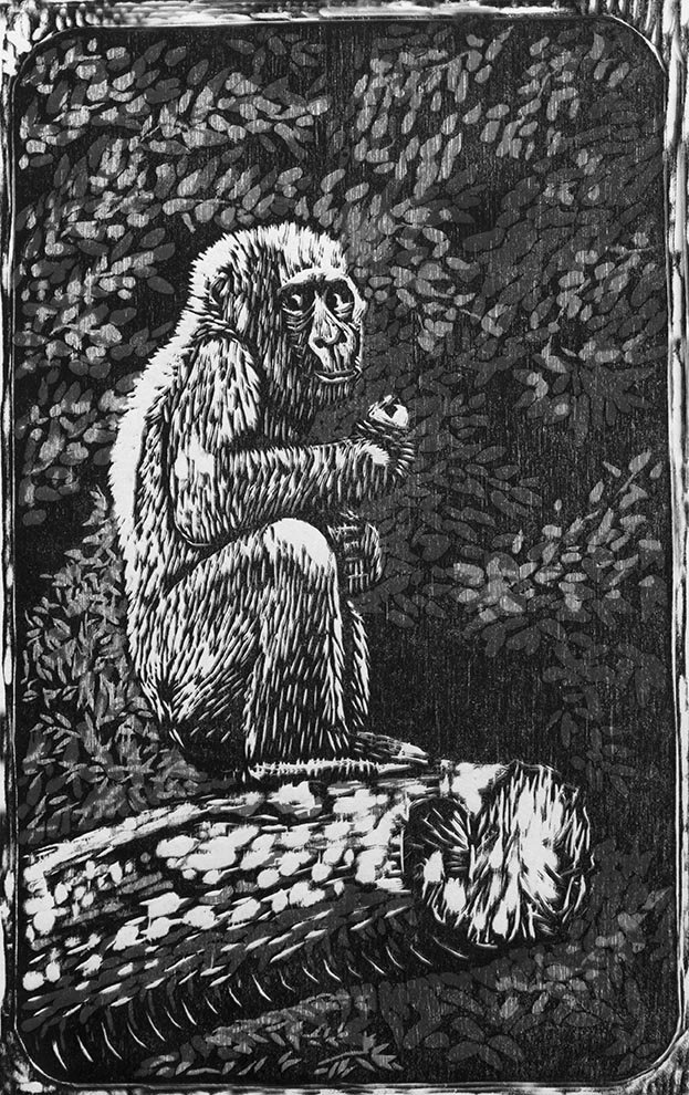 Baby gorilla in grijstinten. Houtsnede, reductietechniek. Oplage 6 stuks.