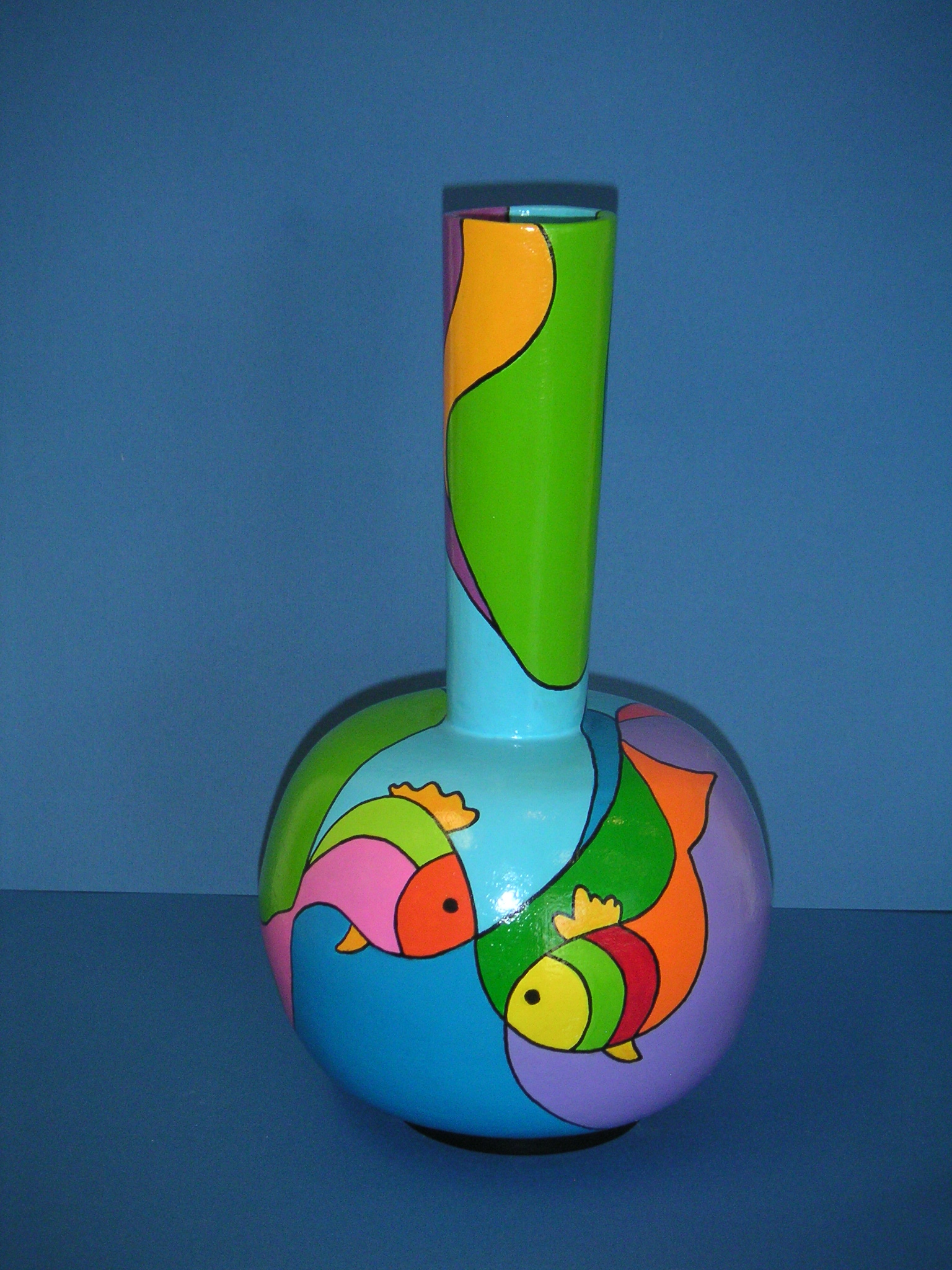 Deze vaas is van bamboe. De buitenkant heb ik bewerkt met milieuvriendelijk kunsthars “Acrylic-one” waardoor de vaas een harde toplaag heeft en nagenoeg onbreekbaar is. Door het schuren van de vele lagen ontstaat er een mooi glad oppervlak. De vaas heb ik beschilderd met acrylverf en afgewerkt met een hoogglansvernis. Het is een kunstobject en niet bedoeld als bloemenvaas.