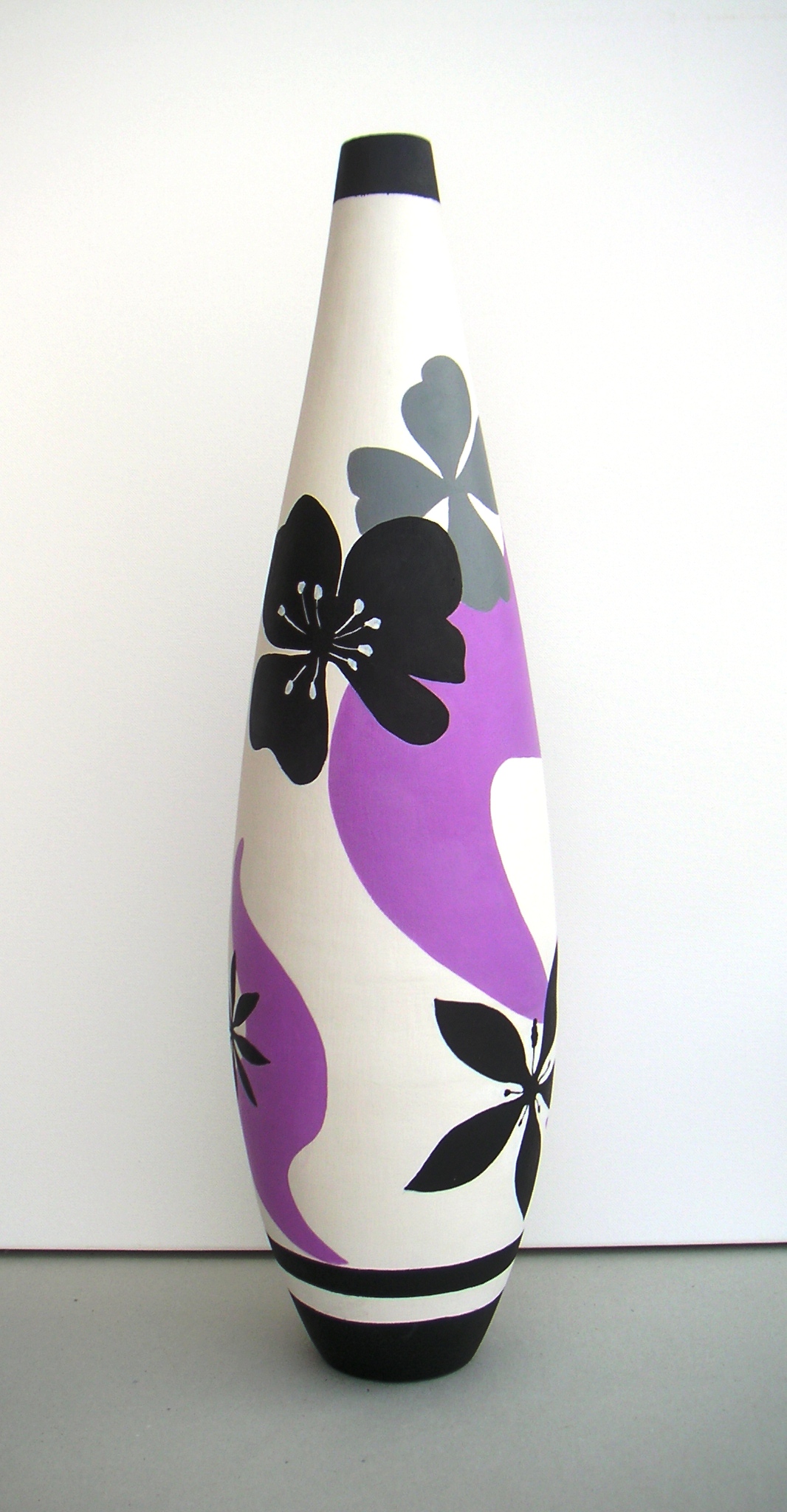 Deze vaas is van bamboe. De buitenkant heb ik bewerkt met milieuvriendelijk kunsthars “Acrylic-one” waardoor de vaas een harde toplaag heeft en nagenoeg onbreekbaar is. Door het schuren van de vele lagen ontstaat er een mooi glad oppervlak. De vaas heb ik beschilderd met acrylverf en afgewerkt met een hoogglansvernis. Het is een kunstobject en niet bedoeld als bloemenvaas.