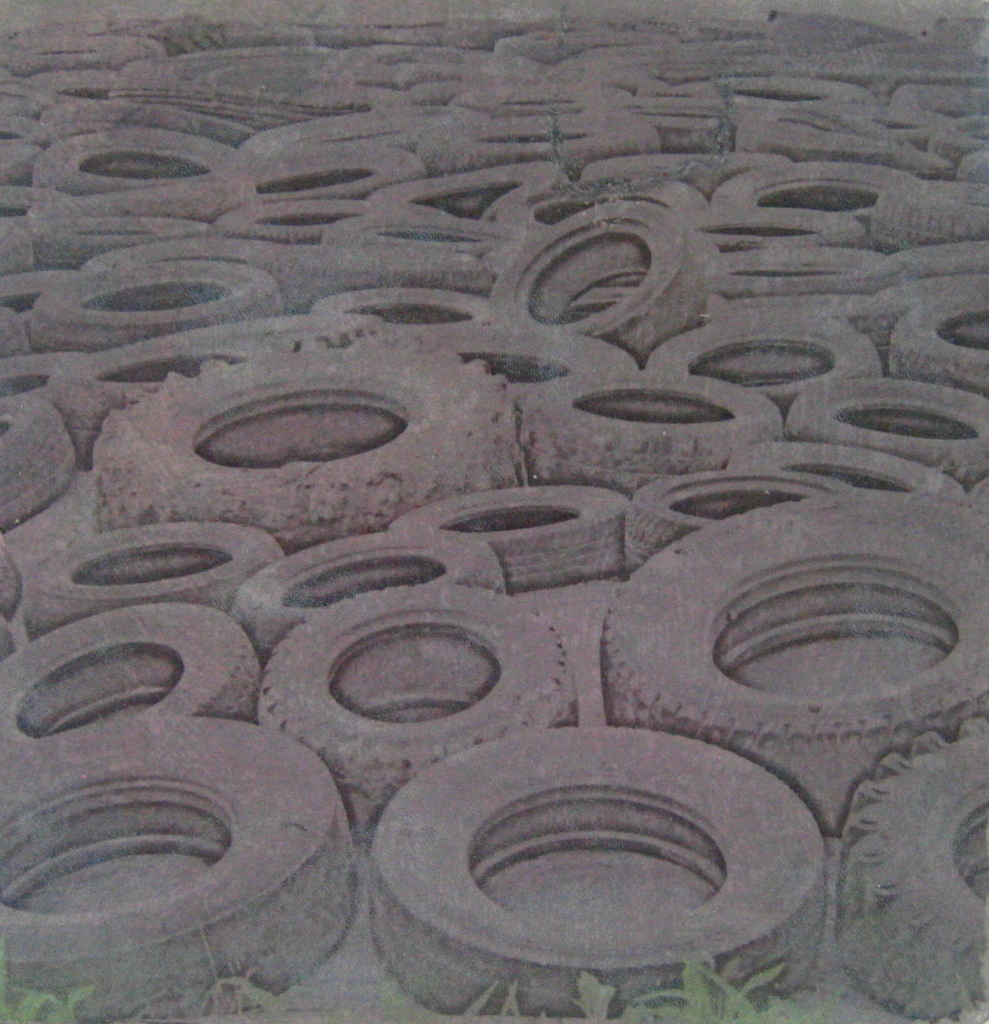 Grote groep auto en tractor banden op een boerderij