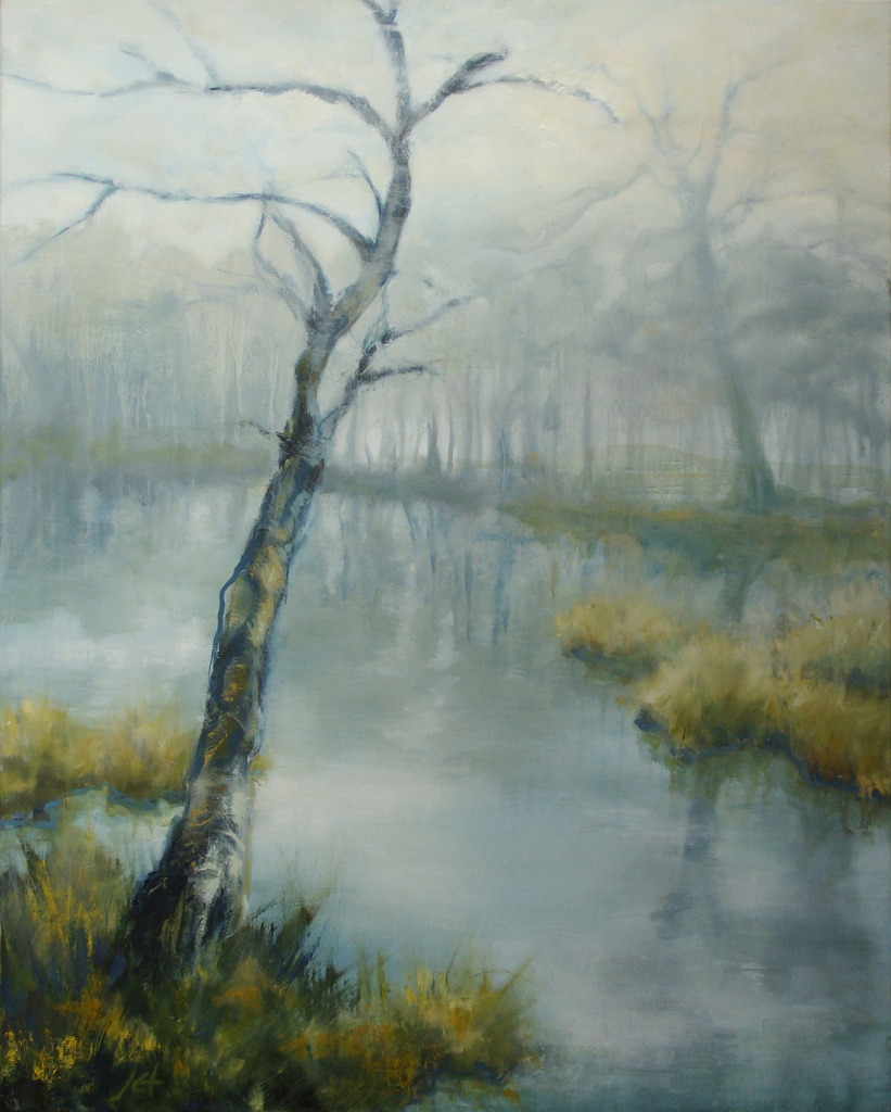 De stille koelte van een mistochtend boven water, met vaag de glans van een mógelijk nog komend zonnetje.