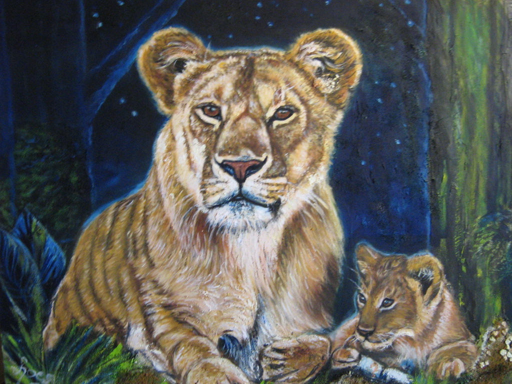 leeuwin met jong ,bij nacht in olieverf, maar ik heb hier verschillende materialen gebruikt