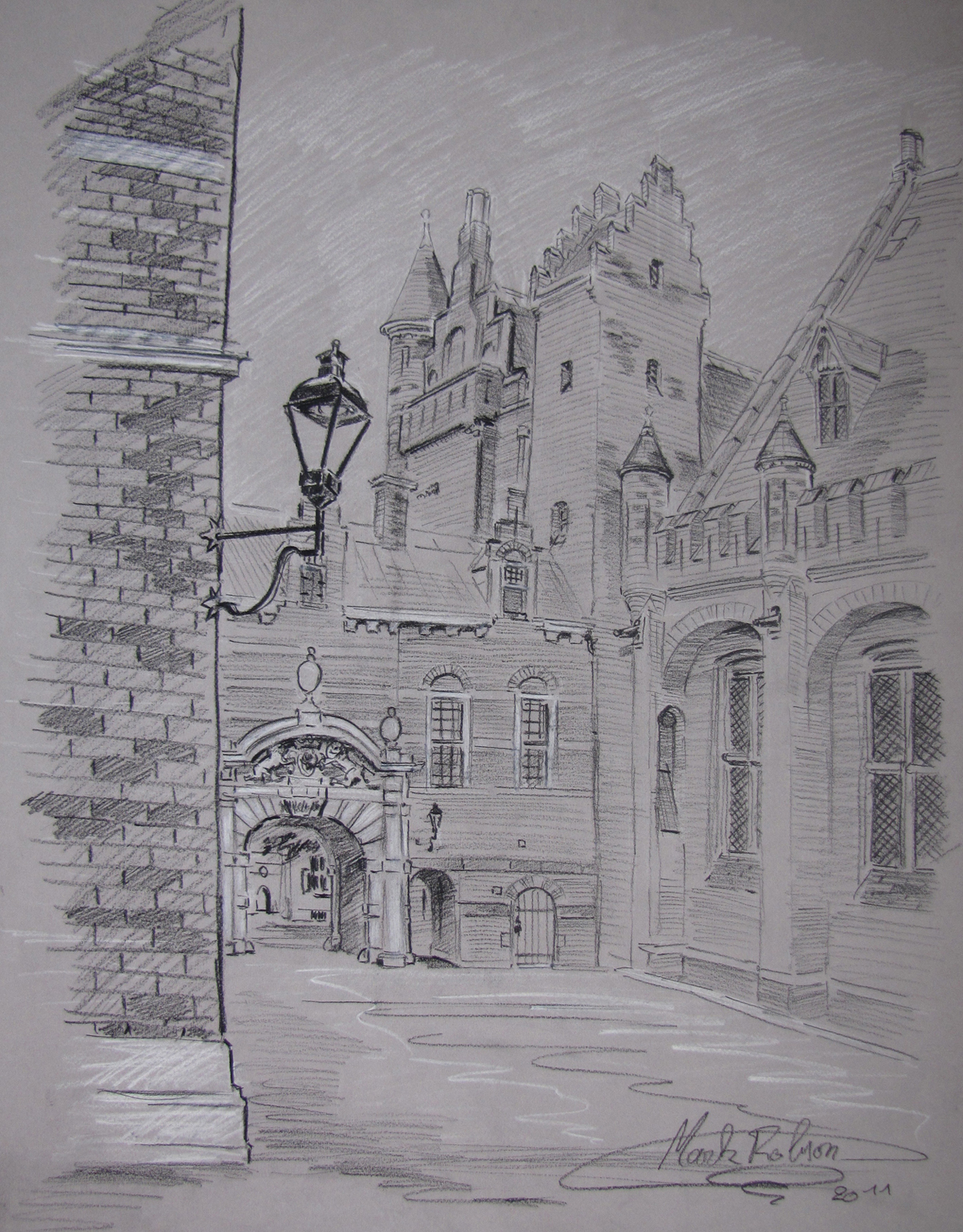 Studie van een hoekje van het Binnenhof, met de zijkant van de Ridderzaal. Het Binnenhof is de zetel van de Nederlandse democratie.