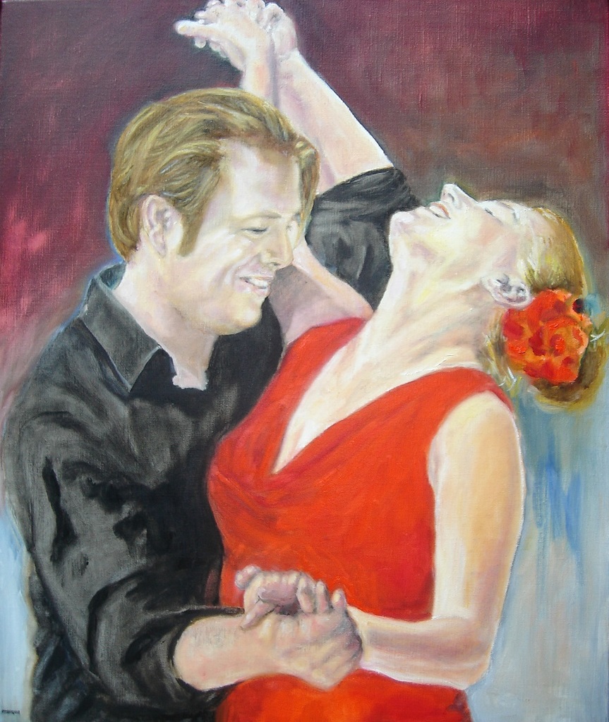 Salsa-dans, een jong stel geschilderd in opdracht. Tijdens het schilderen voelde ik de liefde, passie en plezier. Een super opdracht!