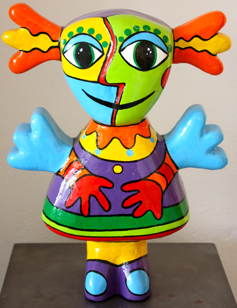 Deze sculptuur heeft letterlijk twee gezichten. Het laat de twee uiteenlopende kanten zien van deze engelachtige fantasiefiguur. Het is gemaakt van watergedragen kunsthars en is beschilderd met acryl verf.