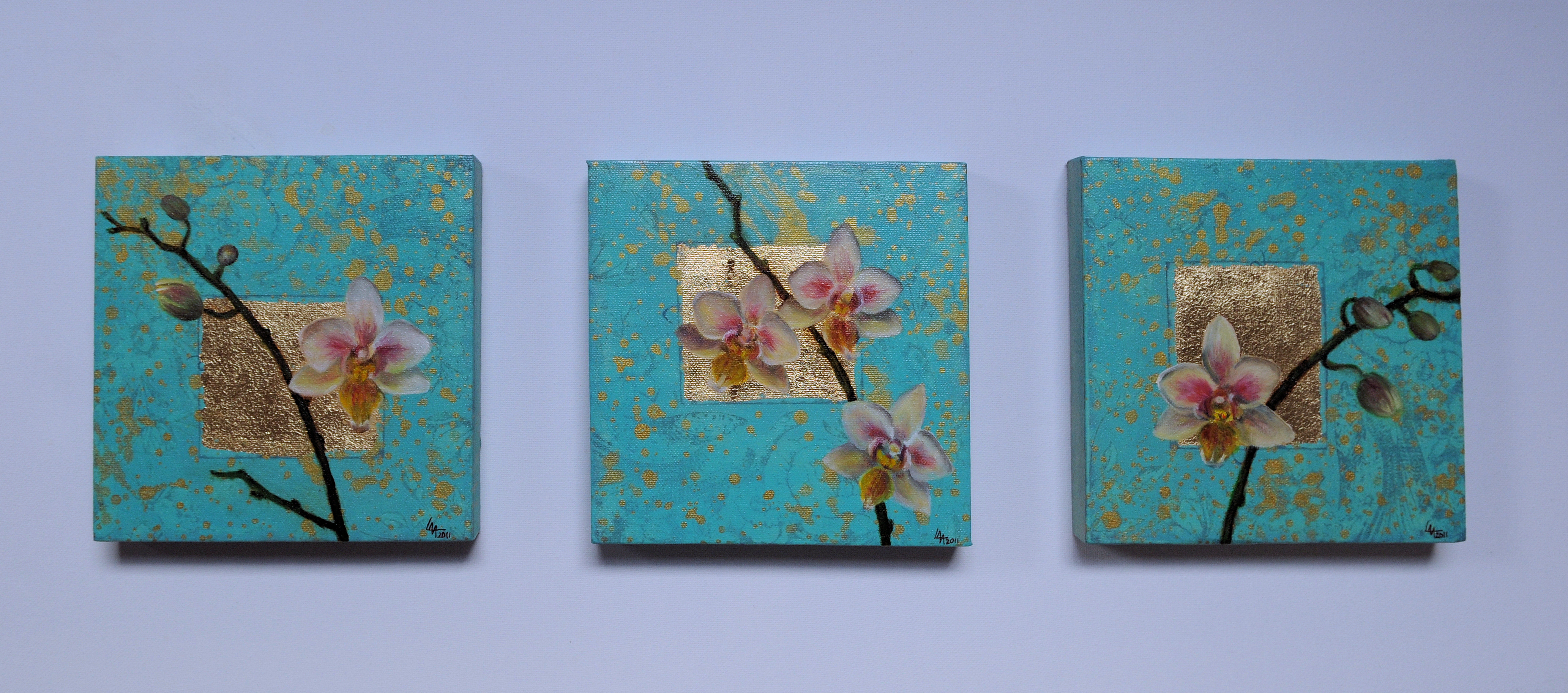 Drieluik orchidee, elk 15x15 cm, olie- en acrylverf met (imitatie) bladgoud. Verkocht.