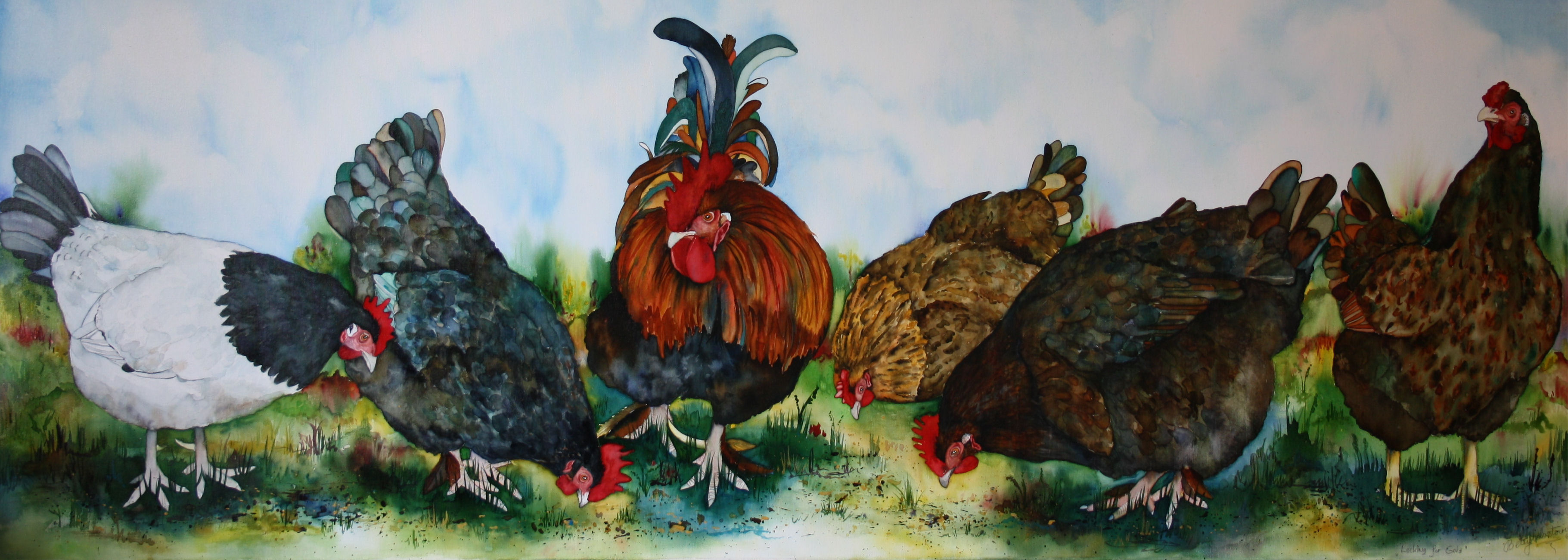 Looking for gold.. met z'n allen op zoek naar het lekkerste......het gouden graan. Groepsportret van onze kippen. Aquarel door speciale techniek op doek geschilderd. Prachtig van kleur en door zijn formaat perfect voor boven de bank.