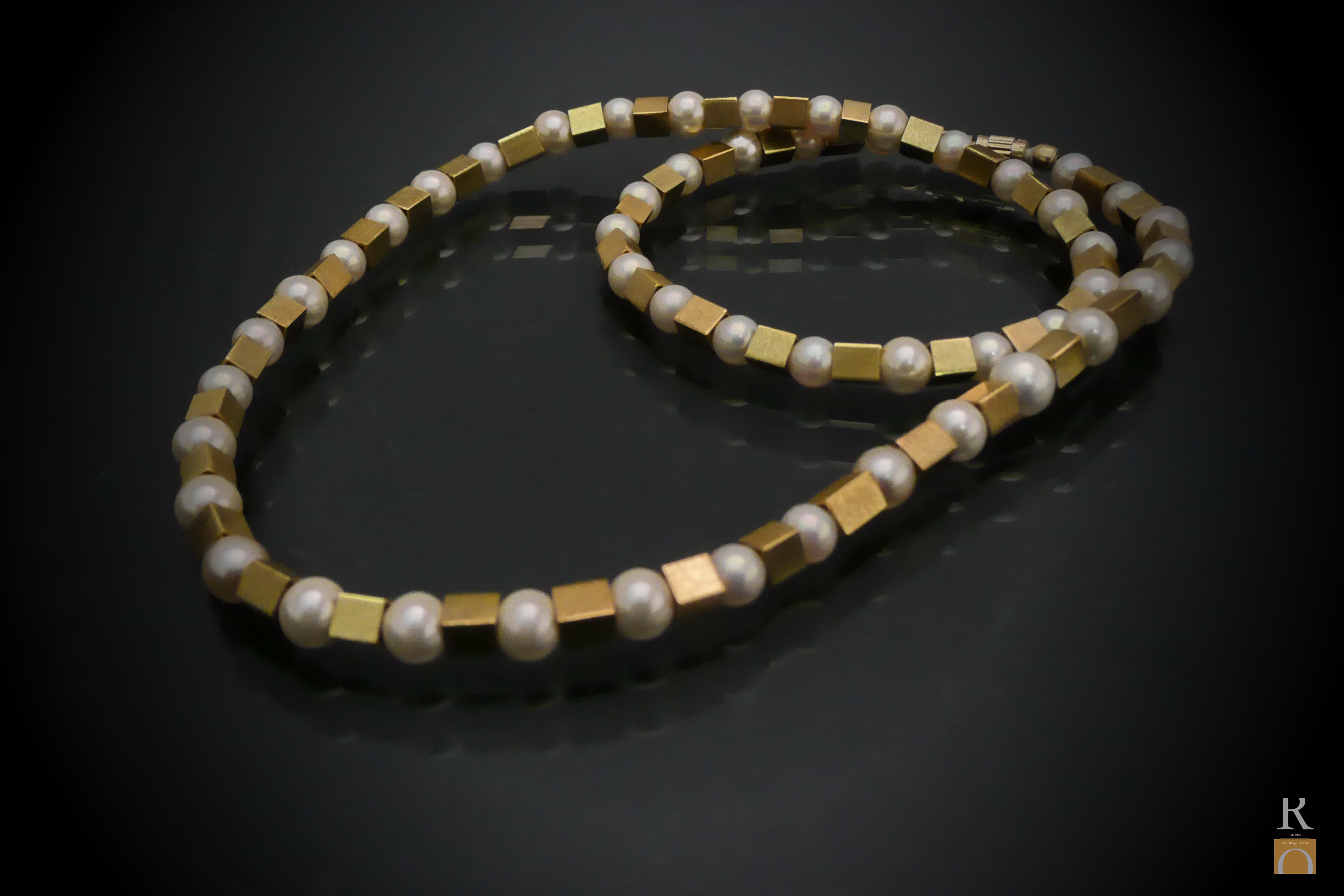 halsketting met parel en messing als moderne variant op de alombekende parelketting