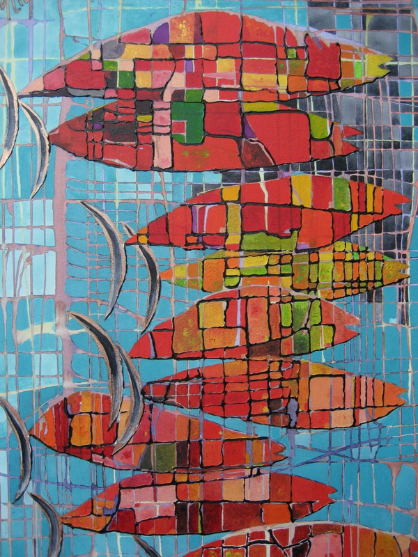'Beweging, herhaling, verstilling', daarin zou je mijn werk kunnen vangen. Een tijdlang wordt een thema (vissen, huizen, bomen, dansende schoenen en voetafdrukken en het onderwerp: "kwetsbaar: de mens") uitgediept, weer losgelaten om vervolgens in een nieuwe verwerking tevoorschijn te komen. Altijd speelt de paradox van alleen te zijn en in communiteit. Eenheid van tegenstellingen, daar gaat het blijkbaar om. Mijn werk toont een vloeiende synthese tussen figuratie en abstractie. Ik bevind me meestal in het grensgebied van beide. Vandaar mijn beschrijving: VRIJE FIGURATIE.