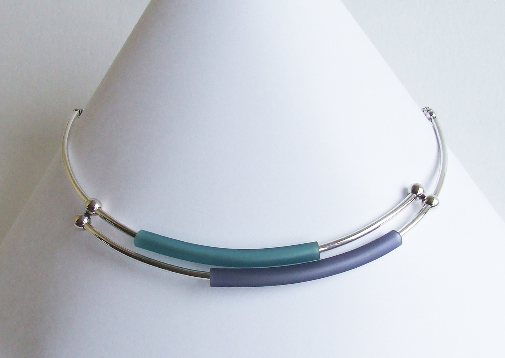 Zilveren halssieraad van buismateriaal, voorzien van 2 magnetische scharnieren. Over de buis kunnen naar keuze 2 van de 14 kleurelementen worden geschoven. Beide buiseinden worden afgesloten met een bolletje, waaraan een 2e schuifbaar is gemonteerd. Het geheel is hooggans gepolijst. (ontwerpopdracht S1131)