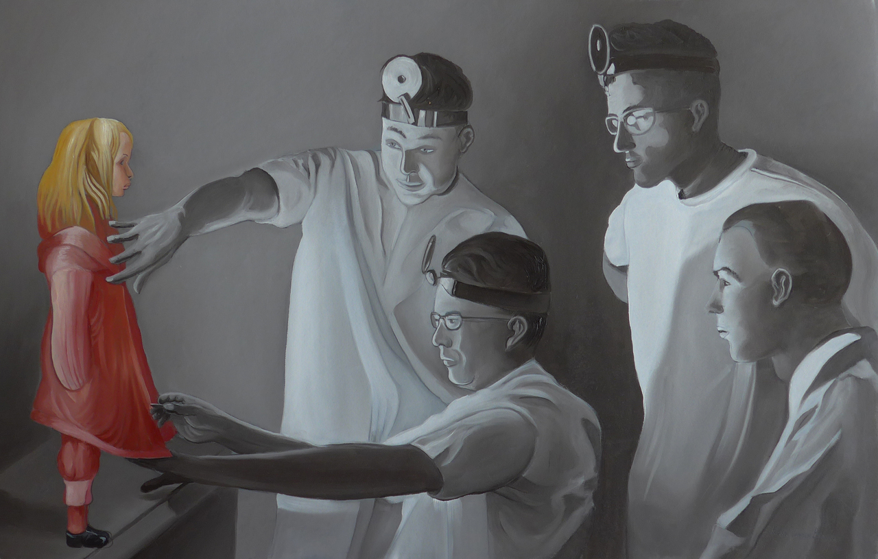 Vier dokters kijken gefascineerd naar een kind dat in het rood is uitgedost. Wie is dit wezen dat zonder enige emotie voor zich uitstaart. Is het soms een experiment ?