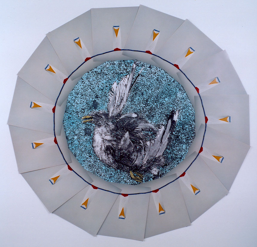 Eerste werk in de serie diafragma's, collage van 15 kleurenfoto's en 1 ingekleurde zwartwitfoto.