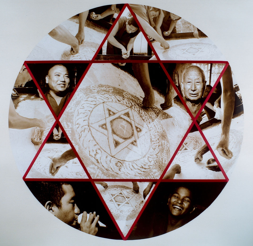 Collage, bestaand uit 13 foto's en katoen lint. Unicaat. Het vervaardigen van een zandmandala en de monniken die eraan werkten.
