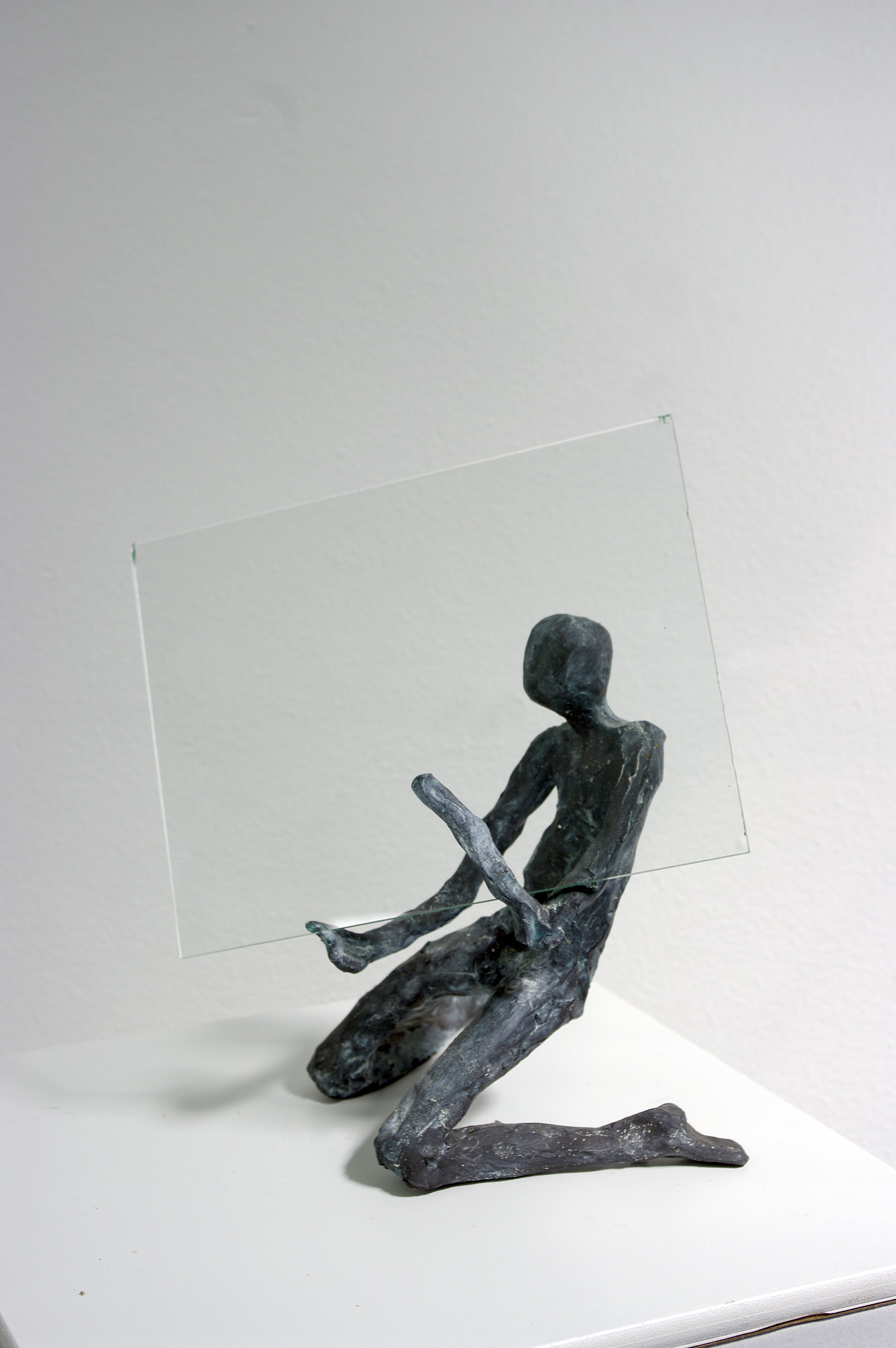 de figuur draagt een glazen plaat en bezwijkt er onder matriaal keramiek en glas
