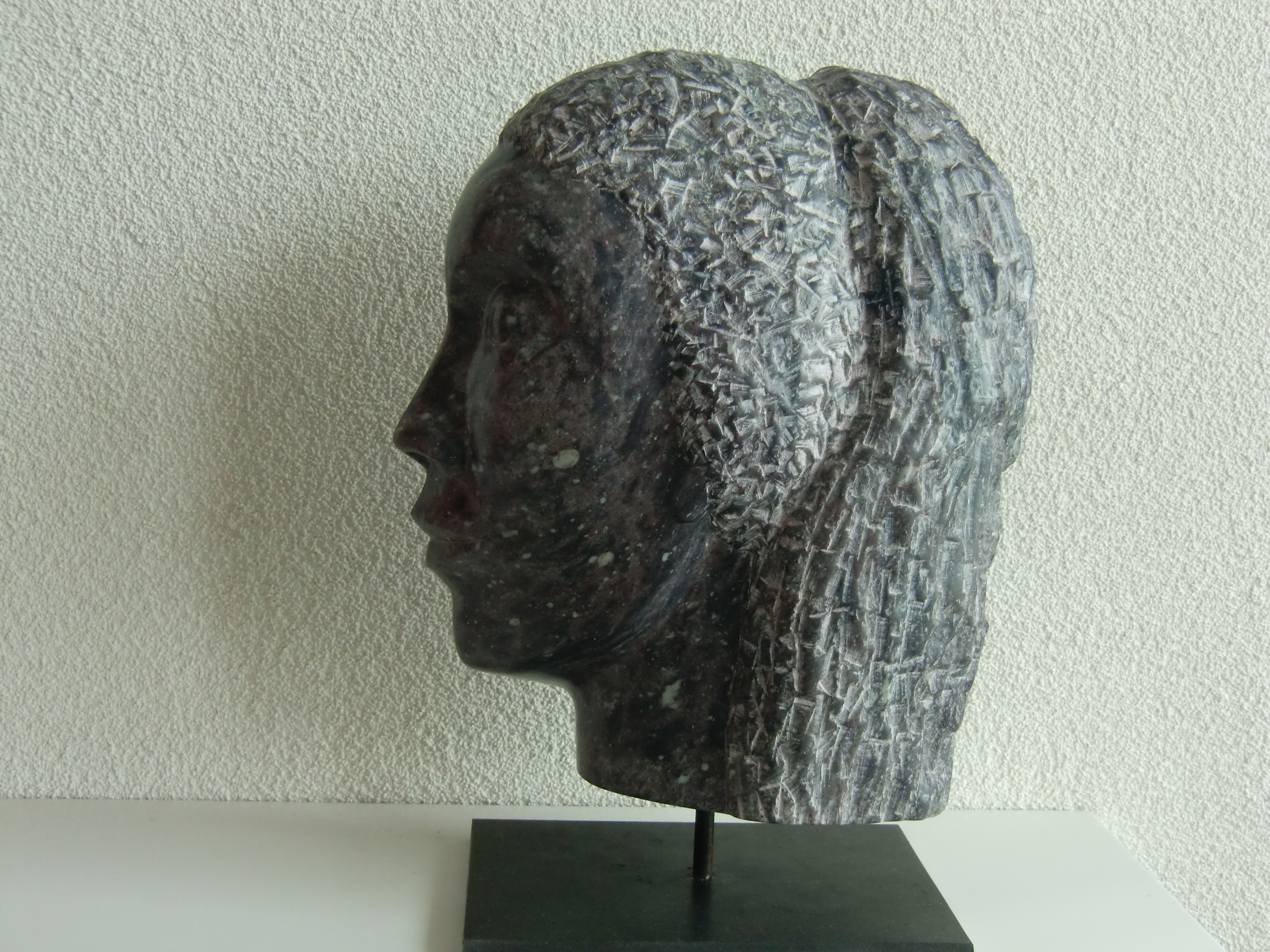 profiel van Iraans paars serpentijn op een stalen sokkel. Eén kant is een vrouwengezicht, de achterkant is niet bewerkt