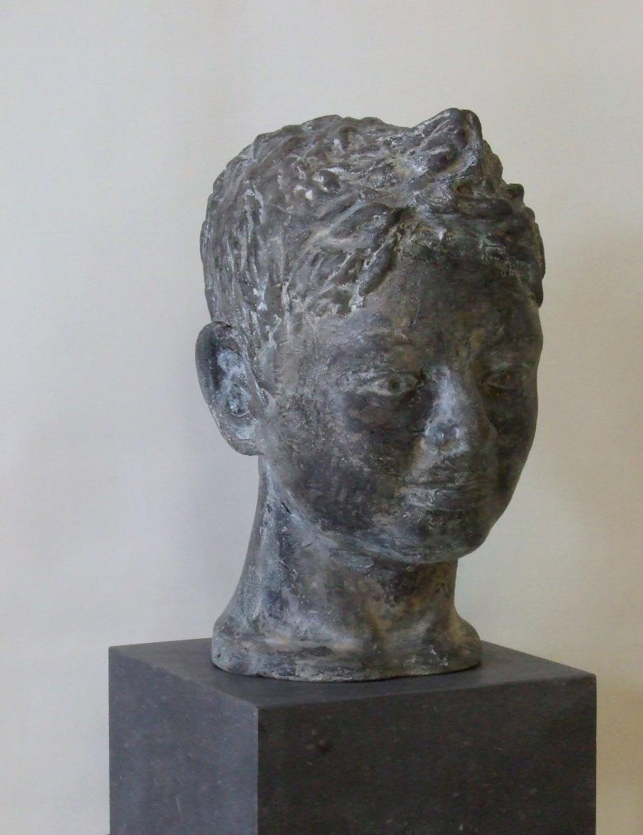 Portret van Tycho, geboetseerd in klei en daarna gegoten in aluminiumcement. Sokkel van Belgisch hardsteen.