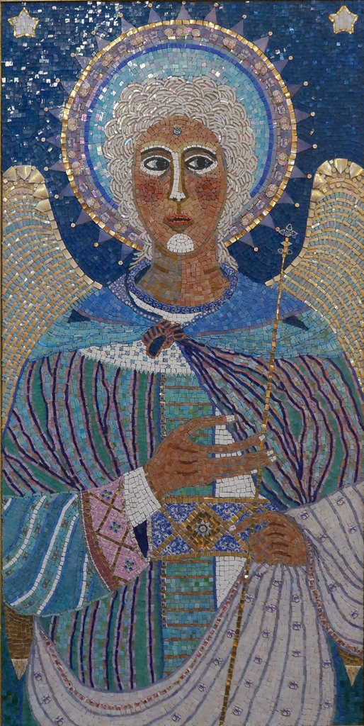 Dit mozaiek is geinspireerd door Byzantijnse religieuze kunst en opgebouwd uit Venetiaans glas en oude porceleinen serviezen.