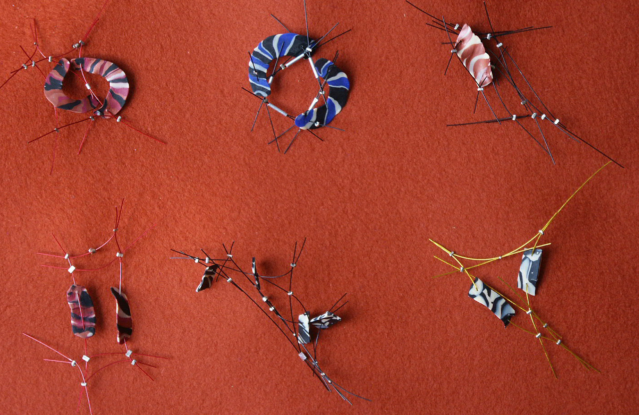 Broche, met staaldraadsprietjes en dunne Fimoklei ertussen. Verschillende soorte beschikbaar, met verschillende kleuren staaldraad: blauw, geel zwart, rood. Prijs per stuk: € 20,-.