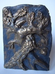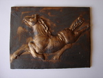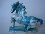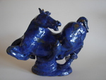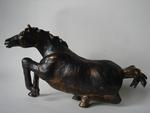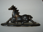 Langgerekt hurkend paard; porcelein/zware grog met bronskleurig glazuur.