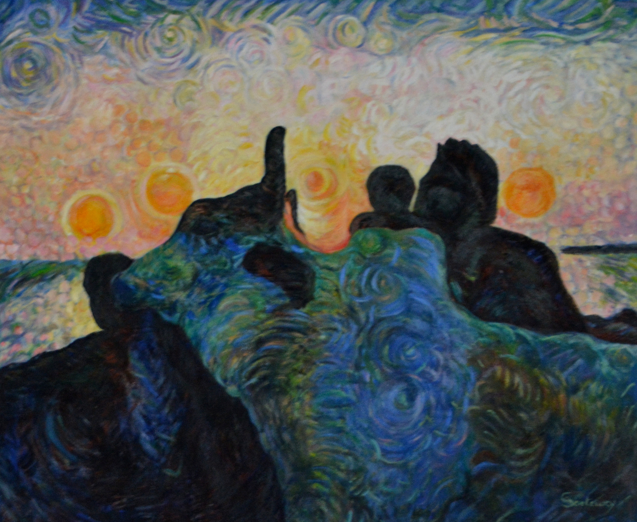 De zon vermenigvuldigd door zichzelf onder een blauw gewelf. De avond wordt als een gebed oranje ingezet...Inspiratiebron uit de deelstaat Gujarat (India)