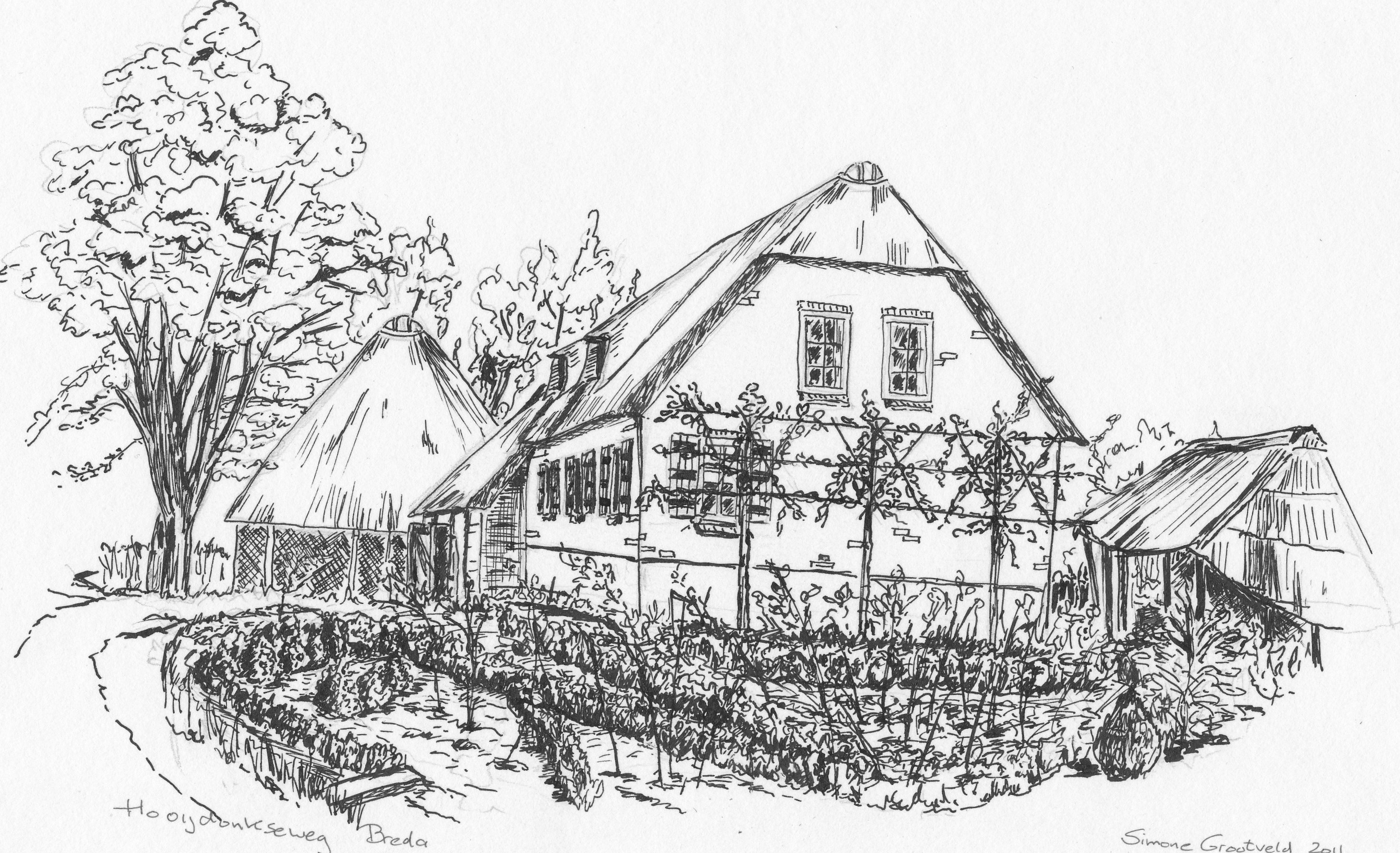 Inkt Pentekening Boerderij Schuur Stadsgezicht Architectuur Breda