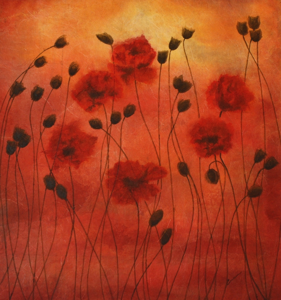 Papavers op Japans papier, omgeven door bloemknoppen en zaaddozen.