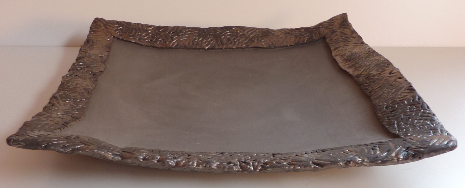 Grote schaal van zwarte klei met bronskleurige rand.