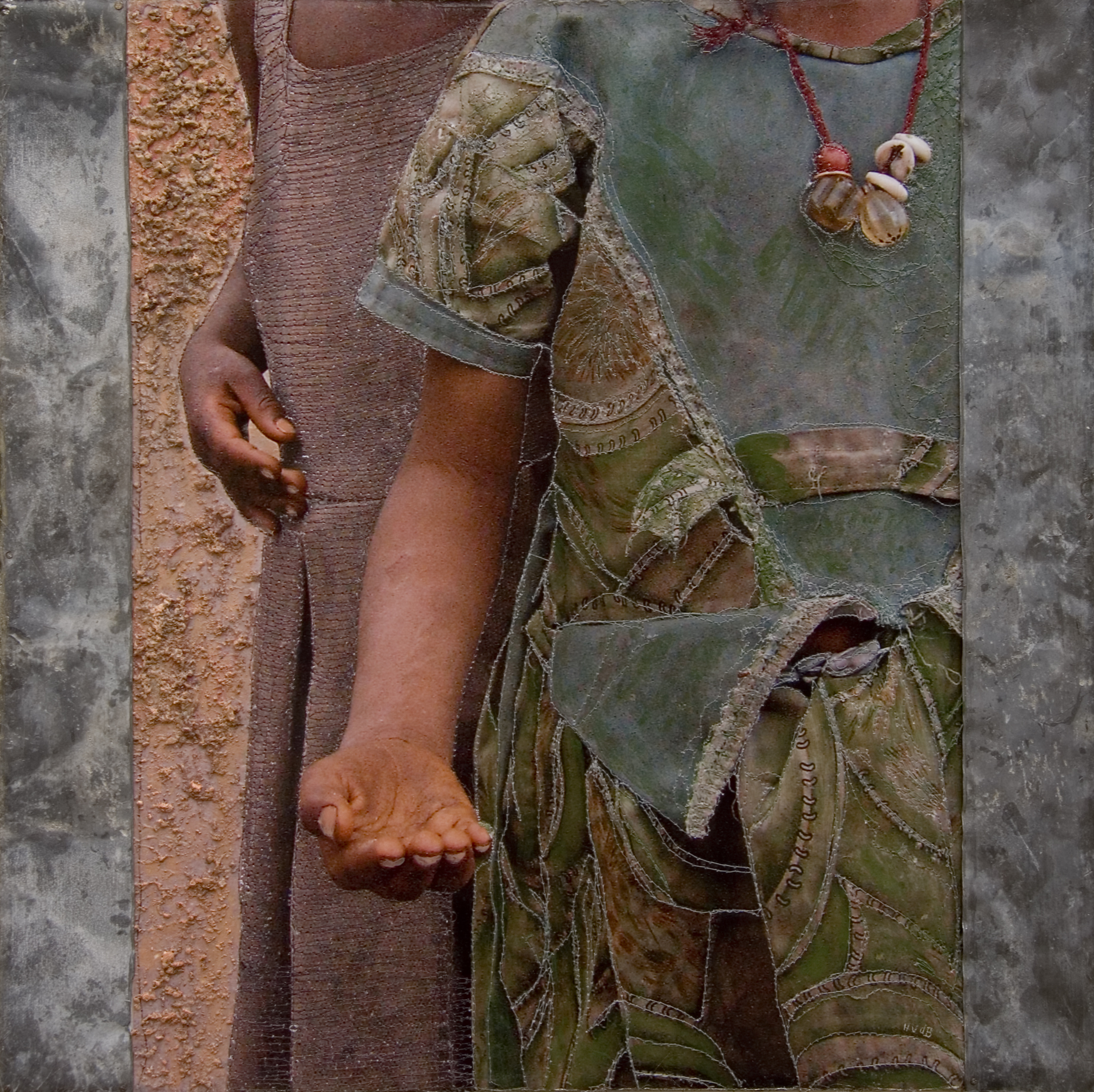 Kinderhand van meisje uit Ethiopië, dat om een snoepje vraagt. Foto met stikwerk, bewerkt met acrylverf en zand, omlijst met loden rand