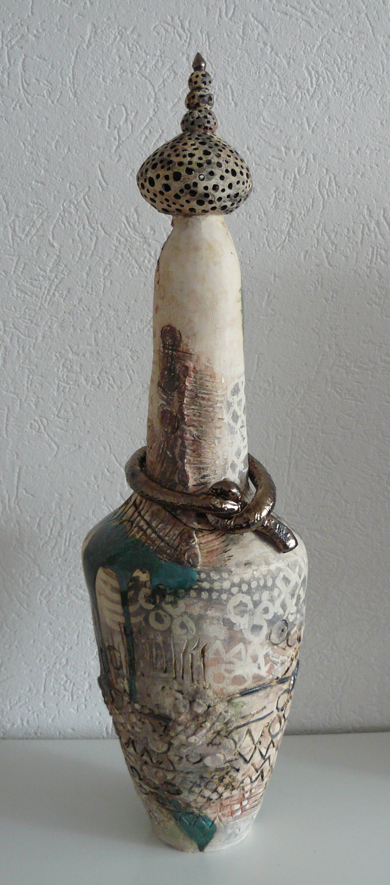 Het object is eerst handgevormd, waarna vormpjes in klei zijn aangebracht. Het bestaat uit twee delen. De vorm is bewerkt met verschillende soorten oxide, engobe en glazuur.