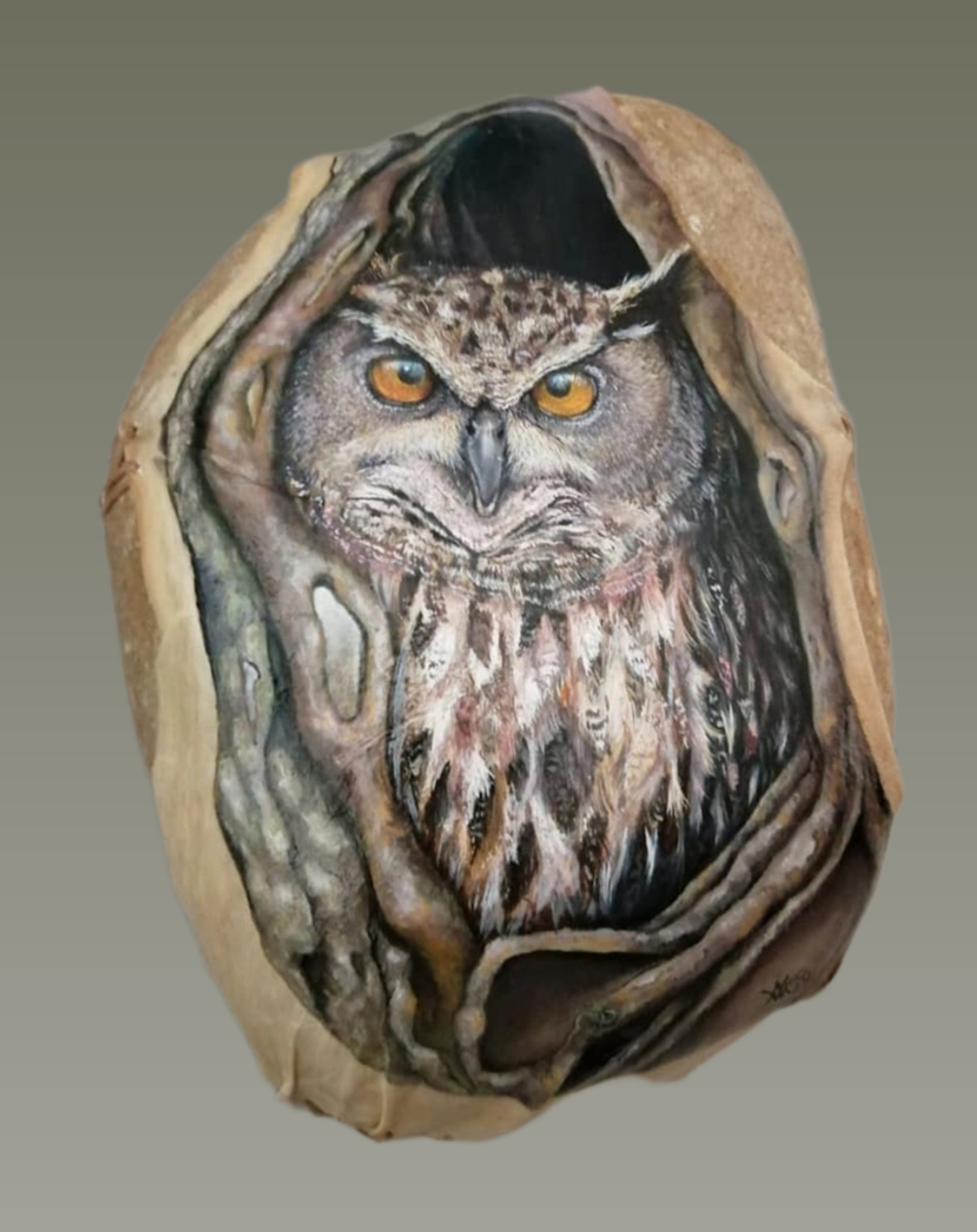 Portret Dier Steen Uil Realistisch Beelden Beschilderd Stenen Fijnschilderen Leer Rawhide