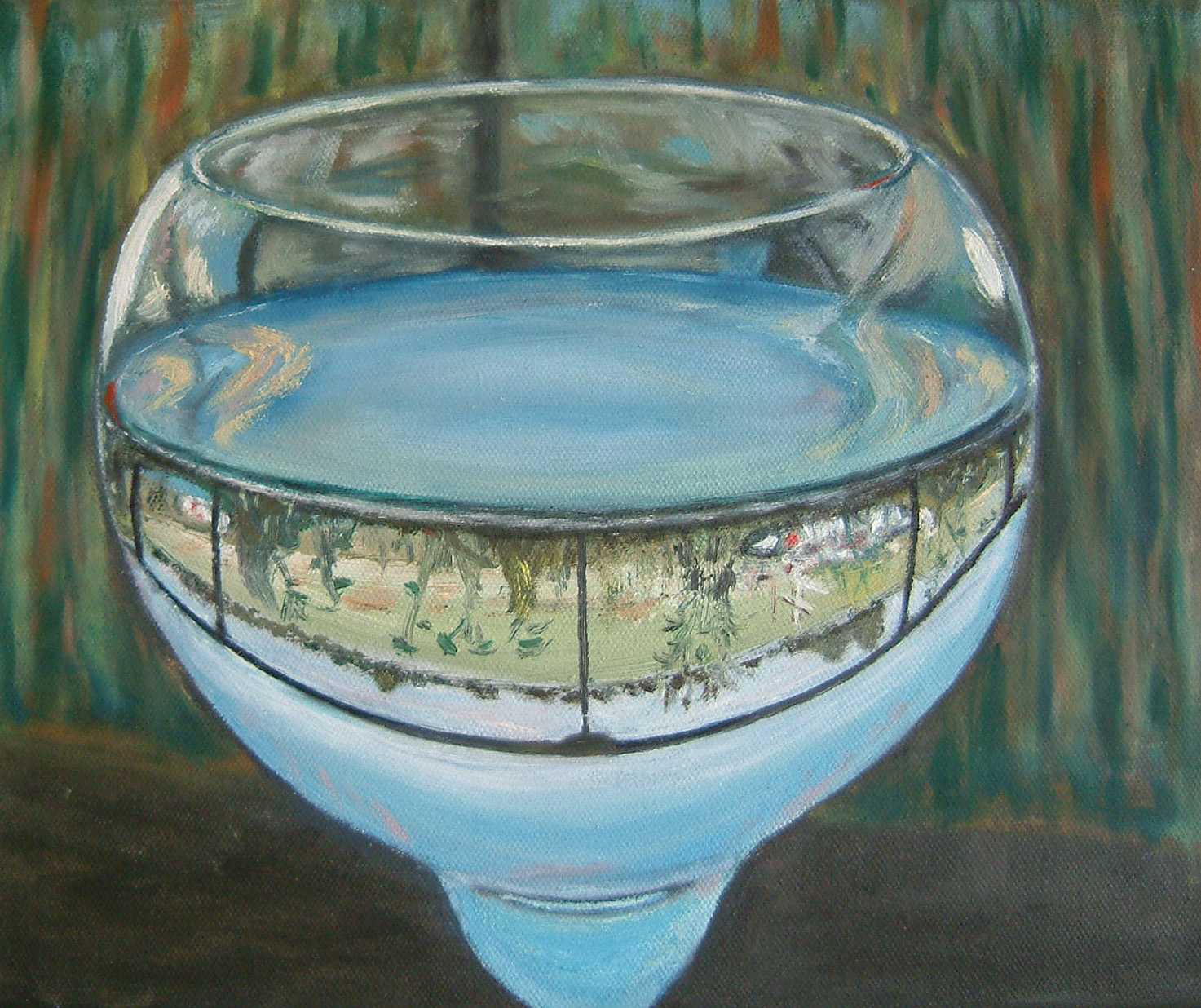 Dit werkje laat een uitzicht zien over de polder vanuit Puttershoek naar 's-Gravendeel. maar dan op z'n kop in een glas witte wijn.