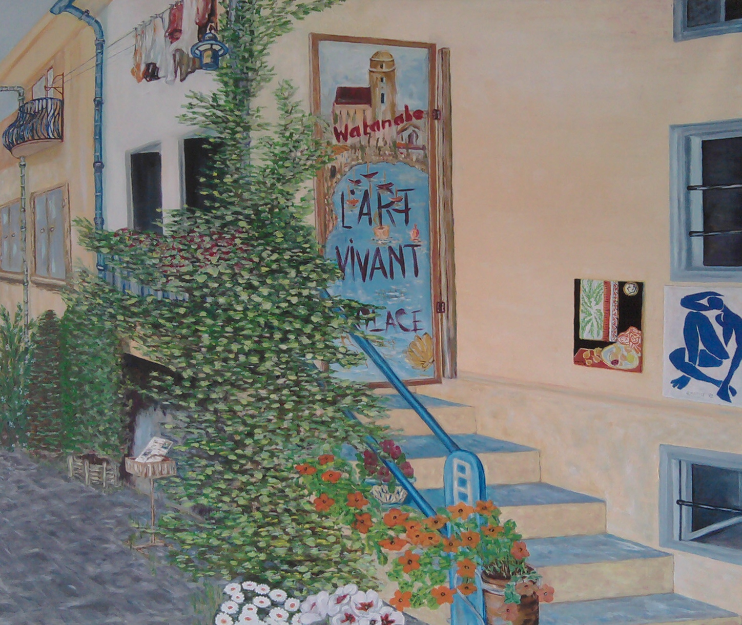 Dit is in een straatje in een stadje (Colioure) aan de Middelandse zee Het is net nog Frankrijk. Even verder is het Spanje. In dit stadje zijn veel bekende schilders wezen schilderen, zoals Matisse, Picasso e.v.a. Aan de muur heb ik 2 werken van Matisse opgehangen. In dit straatje is een winkeltje met schilderijen.Boven aan de trap is een deur die geen deur is, maar een groot schilderij dat als een paneel met scharnieren aan de wand hangt. Erachter is een platje met een ingang naar de galerie.