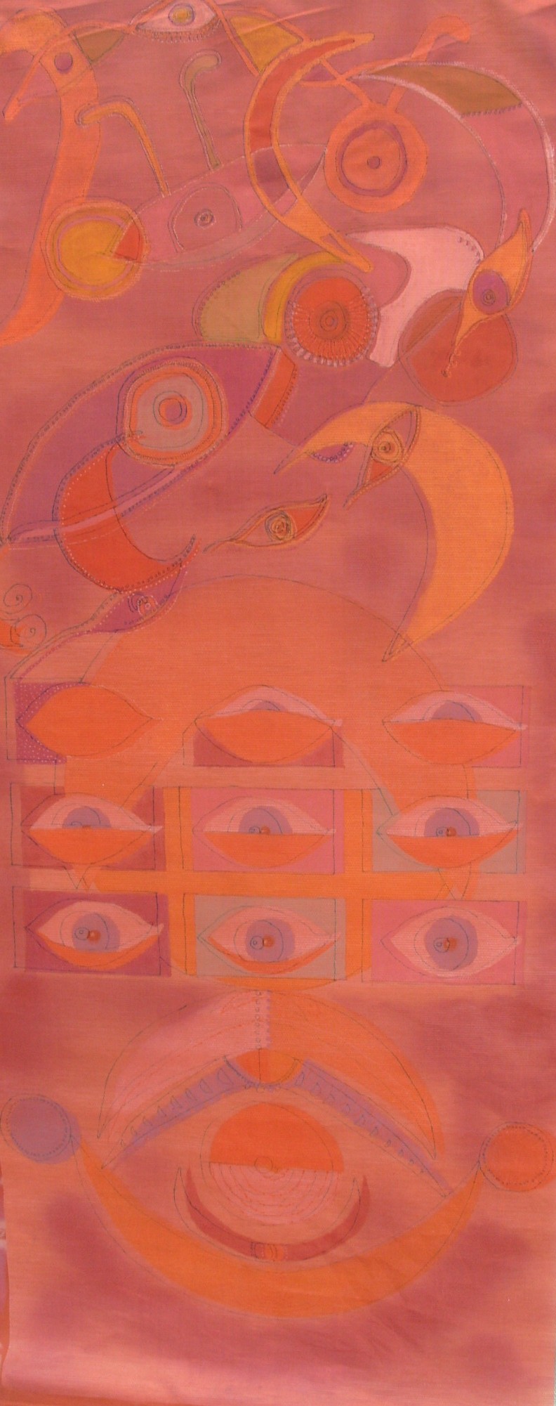 Over de schildering van de maan die het oog ontmoet hangt een transparante oranje voile met de contouren van de vormen eronder.