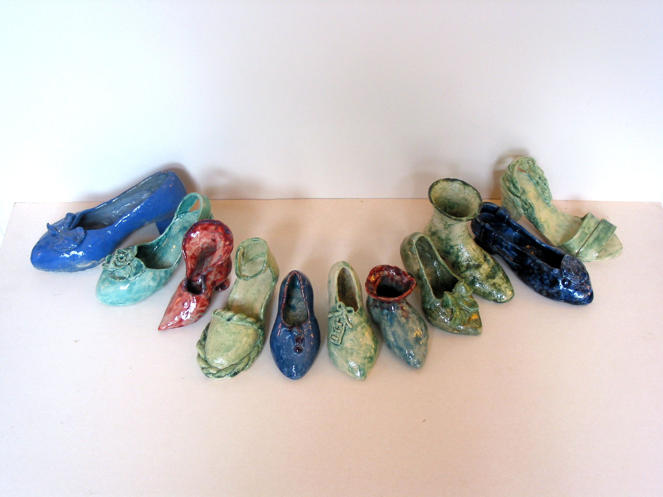 Een collectie schoentjes in keramiek.