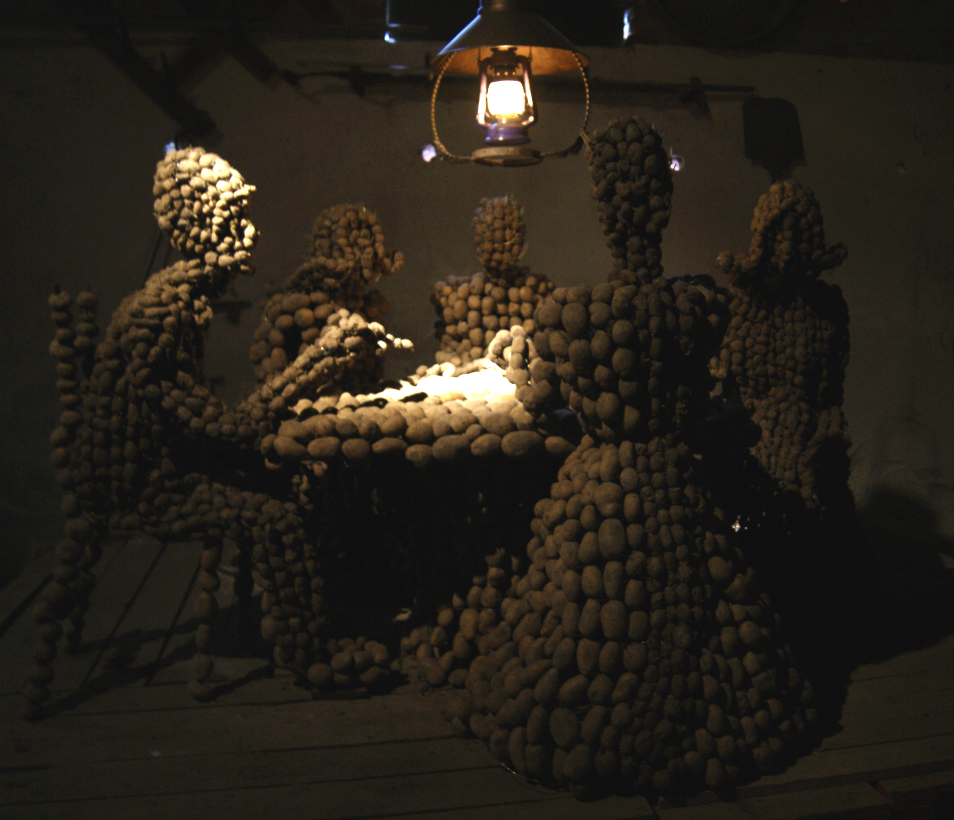 ... De mensfiguren zijn gemaakt van aardappels, een materiaal dat onder invloed van lucht en tijd erg snel zal veranderen en verdrogen. Op die manier symboliseert het de vergankelijkheid, broosheid en het ouder worden van het menselijk lichaam...