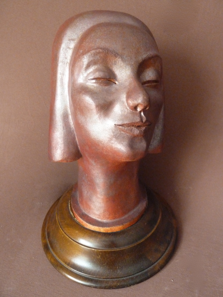 Keramisch met oxides gestookt koperkleurig vrouwenhoofd op houten voet.