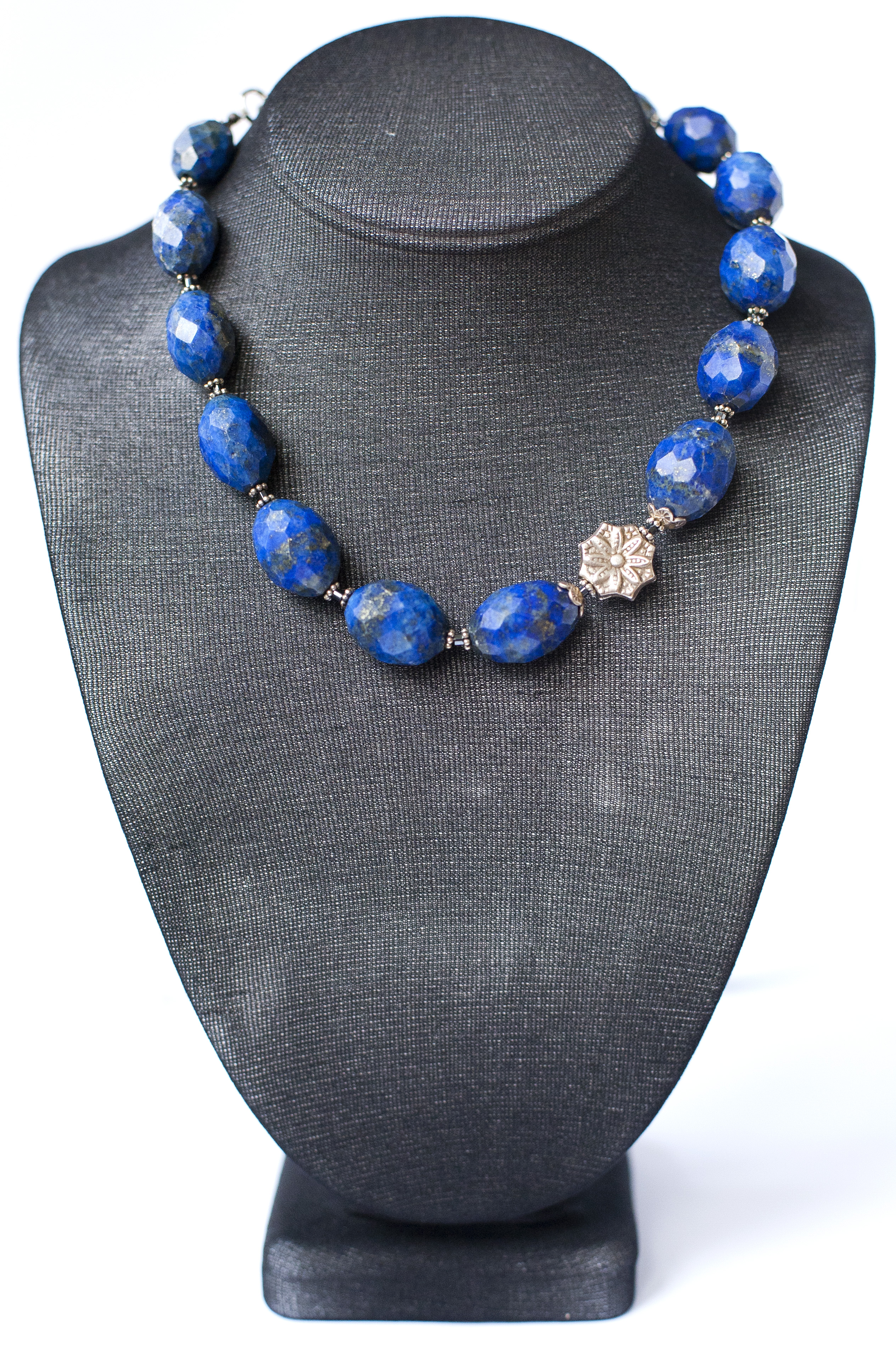 Dit Collier is gemaakt van het natuurlijke mineraal Lapis . Er zijn zilveren onderdelen in verwerkt.