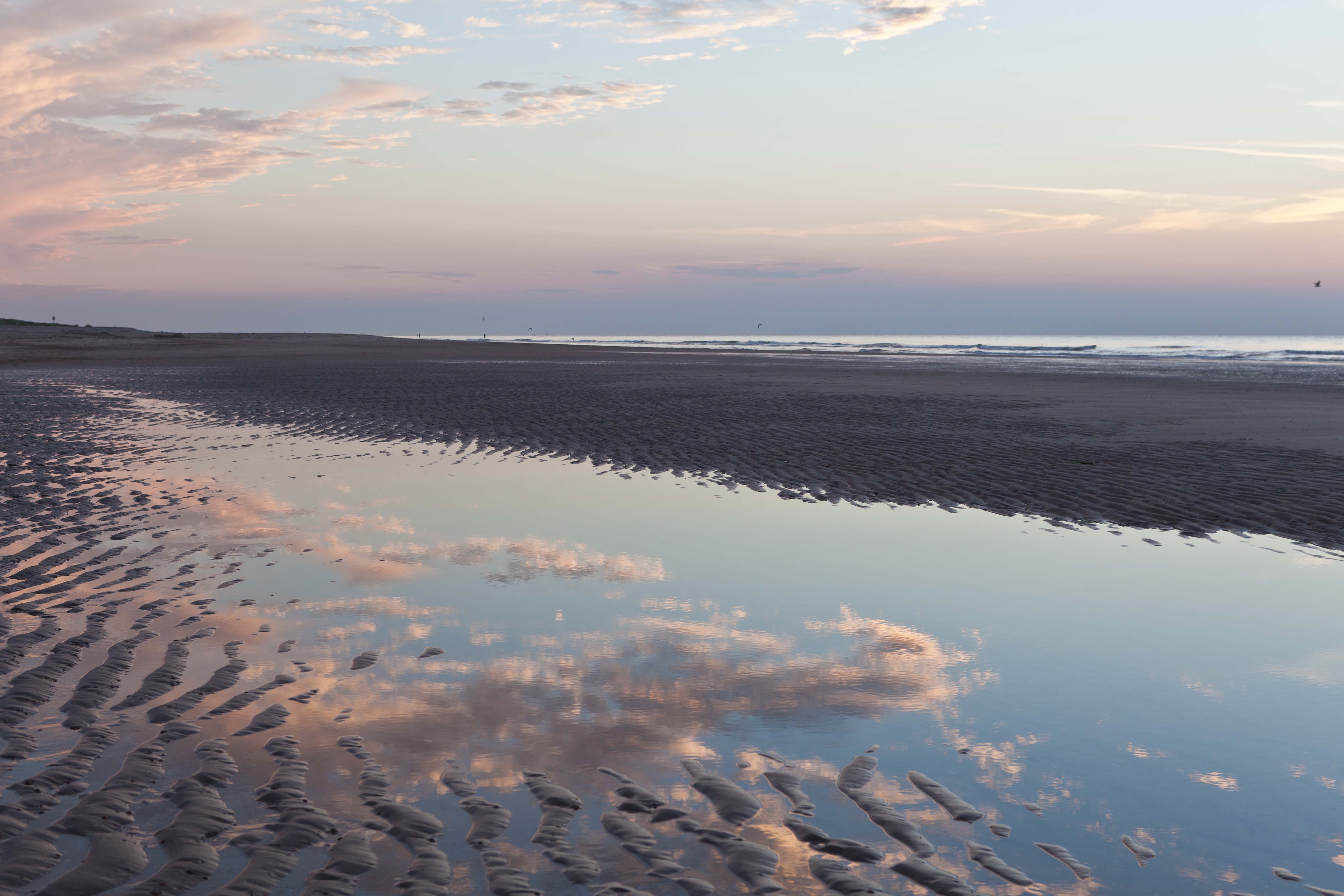 Het spel van de wolken blijft mij fascineren; de strepen, de vormen, de schakeringen van licht naar donker. Altijd boeiend om te zien dat wolkenspel. Na een zomerse dag aan het strand met weerspiegeling…
