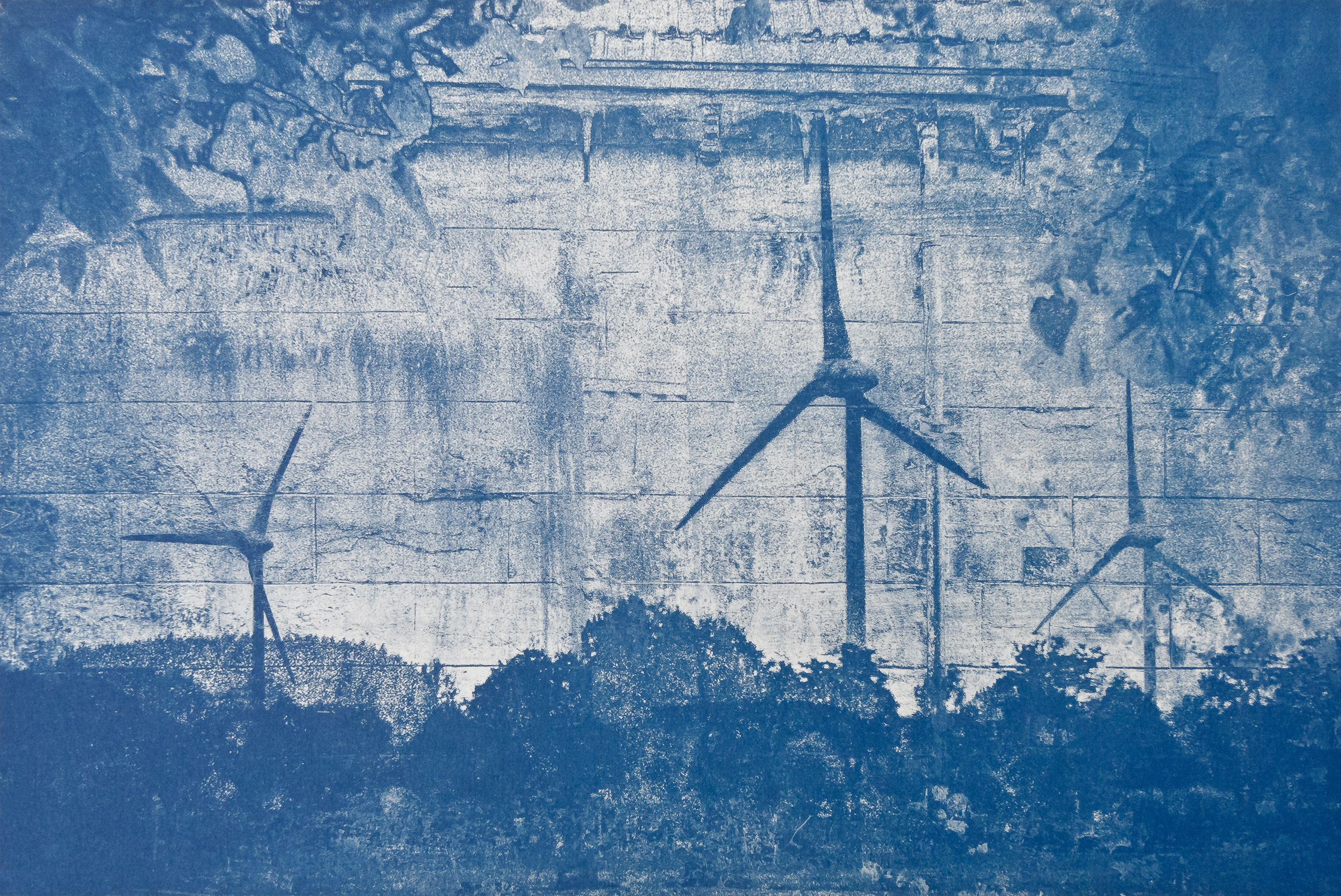 Windturbines in het Groene hart landschap en een stalmuur vormen de elementen van een digitale collage die wordt omgezet in een contactnegatief op ware grootte. Dat negatief is met het cyanoproces afgedrukt. Gemaakt als een studie voor de Groene hartkunstprijs 2011 en bedoeld als oproep om kritsch te kijken naar aanpassingen aan het landschap. Ingezonden is Wind. Zie voor versie zonder strakgemaakte randen: www.jaapderaatphoto.com Kenmerken: 41x 29 gedrukt als cyanotypie op Canson Montval, 300 grs. aquarelpapier. Slechts één exemplaar wordt verkocht en een druk blijft in bezit van de maker voor expositiedoeleinden.