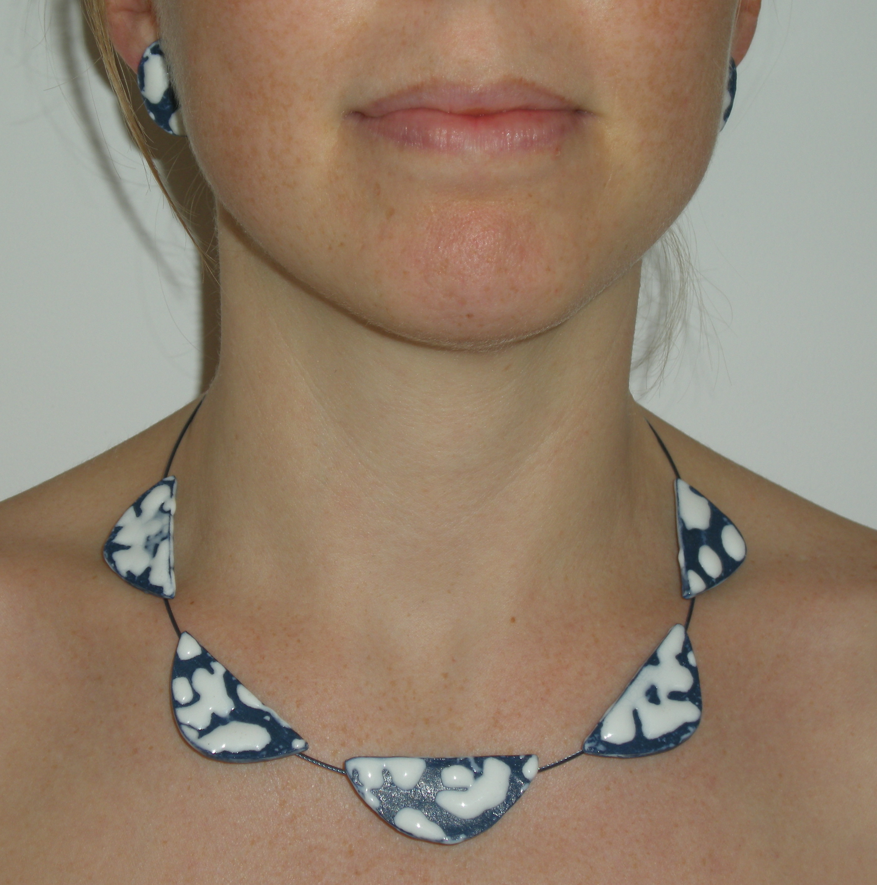 ketting en oorstekers van blauwgekleurd porselein met wit glazuren druppels