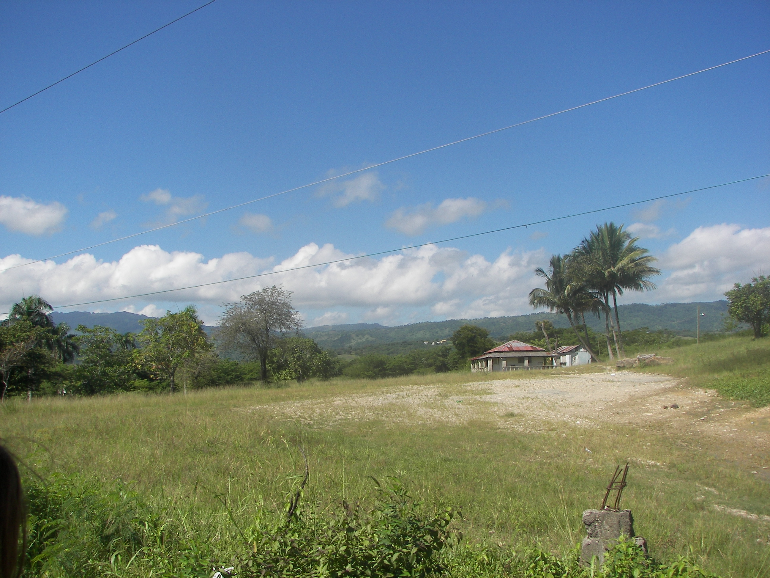 Het groene landschap en de mooie blauwe lucht.