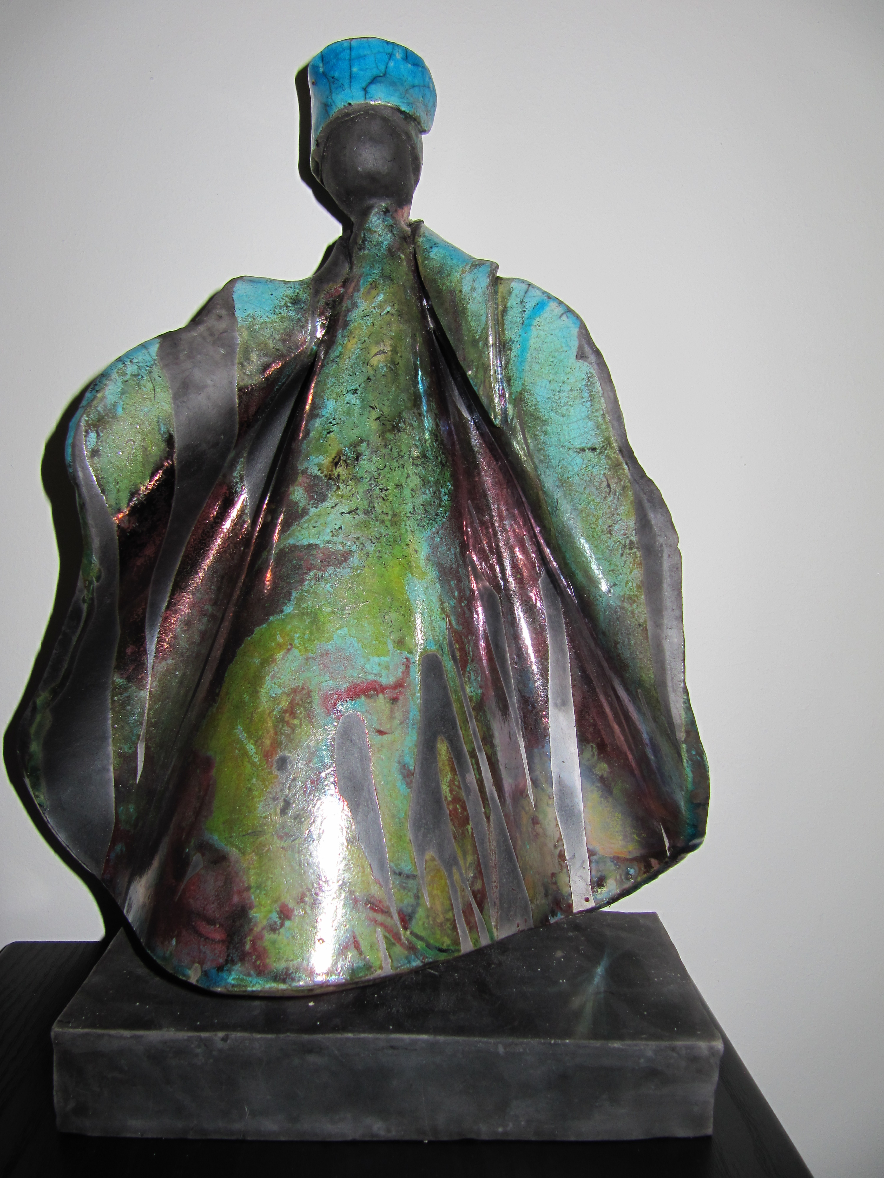 Vrouw in de wind, Raku gestookt met veel oxide effect. De vrouw staat op een zwarte raku sokkel.