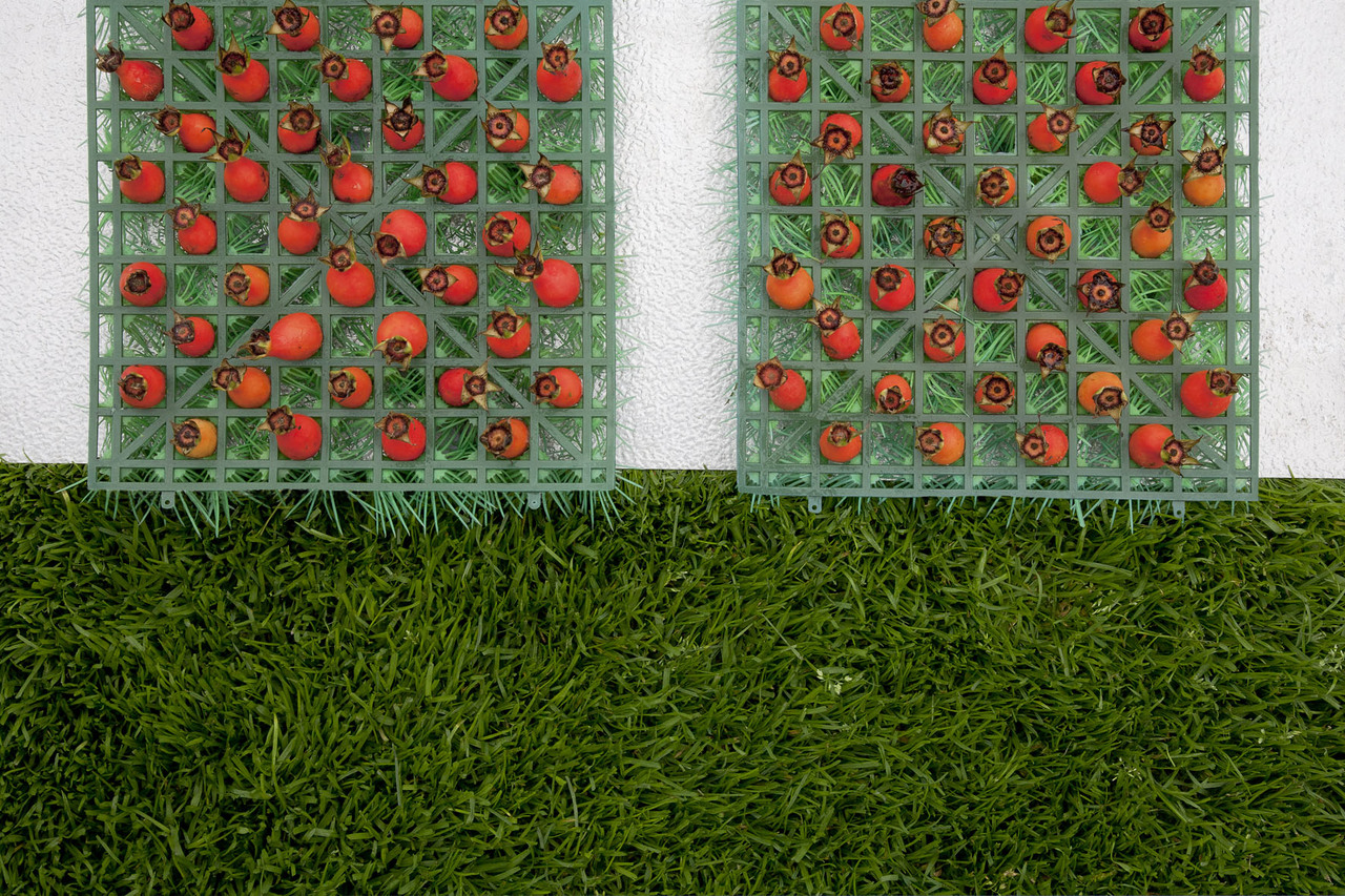 oranjerode rozebottels afstekend tegen het groene gras, gestileerd.