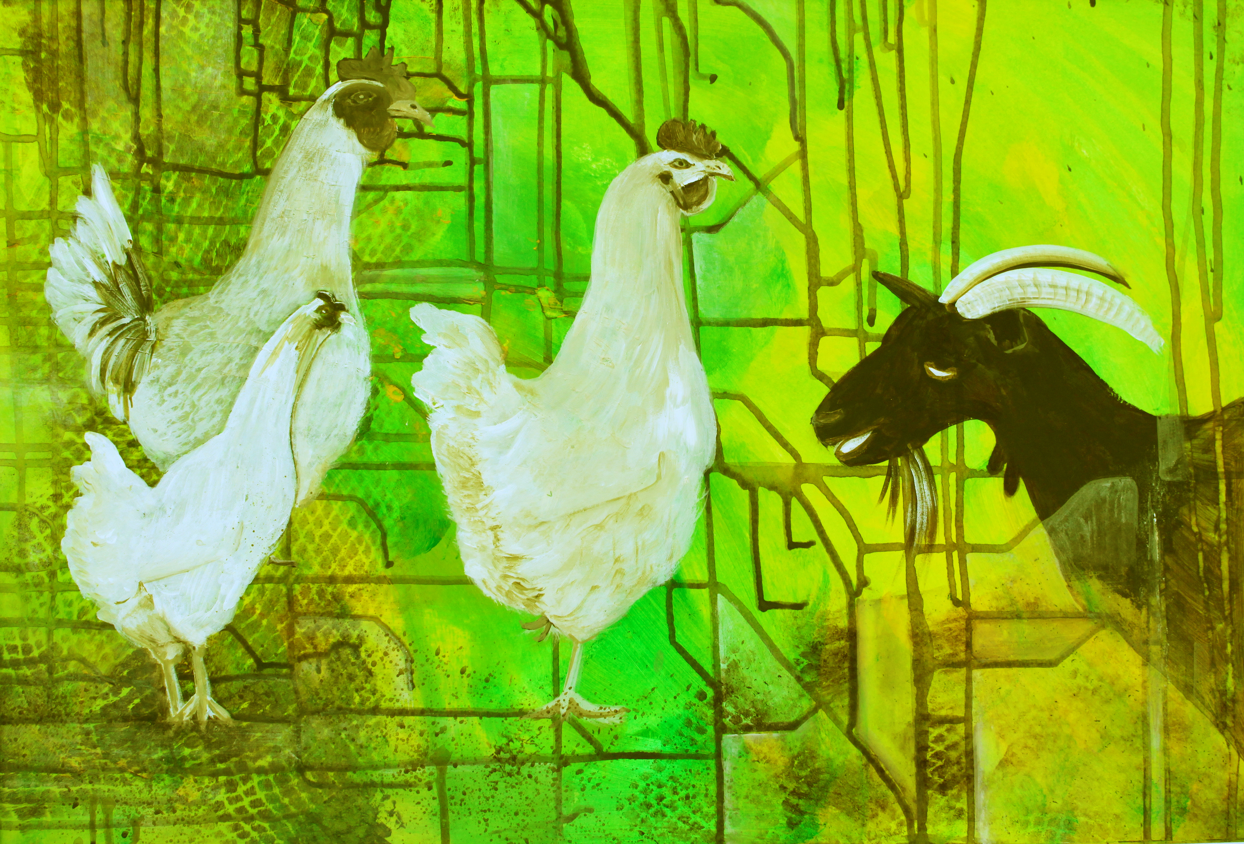 Wit Geel Acryl Yellow Groen Bruin Papier Realistisch Green Verhalend Drie White Brown Paper Kippen Geit Goat Colours Three Felgekleurd Realistic Chickens Bright Acrylics